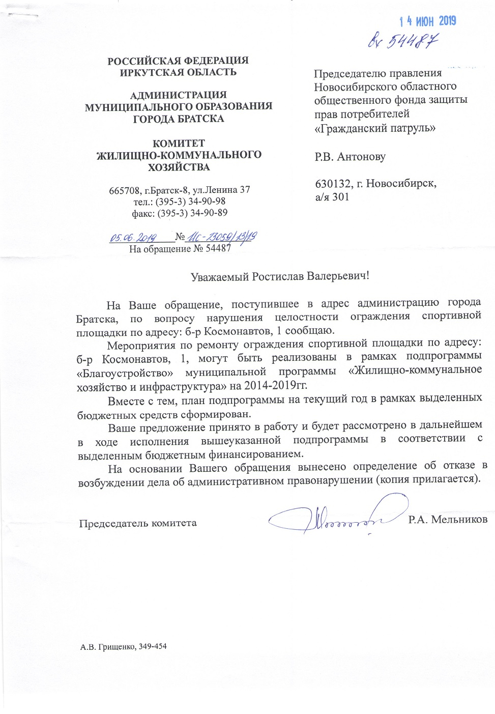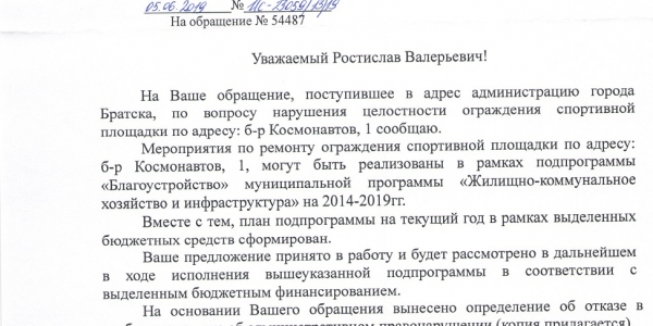 Номер жалобы:54487 Тип жалобы:Прочее Название объекта: Регион:Иркутская область Город:Братск Адрес:бульвар Космонавтов, 1 Описание жалобы:Порвано ограждение спортивной площадки Статус: