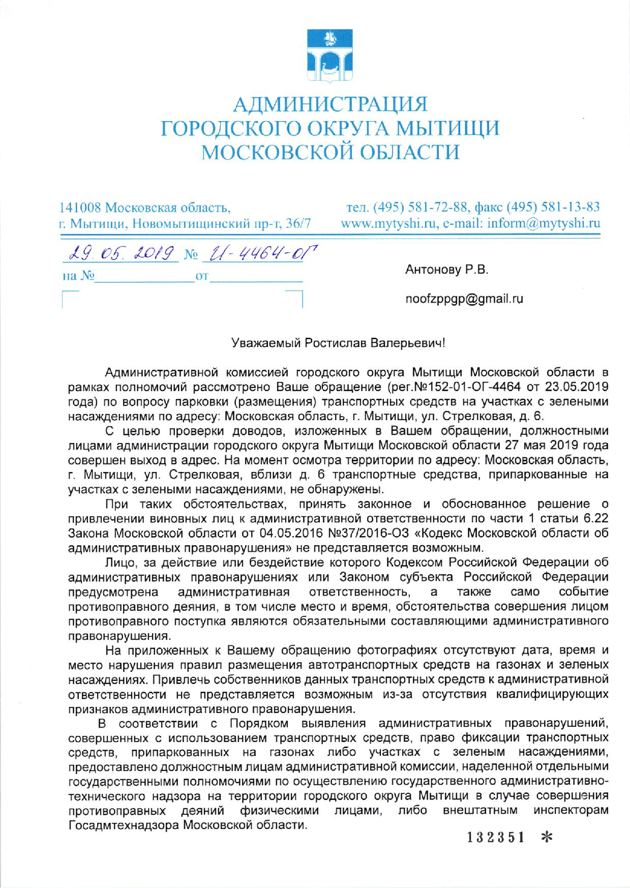 Номер жалобы:54423 Тип жалобы:Прочее Название объекта: Регион:Московская область Город:Мытищи Адрес:Стрелковая улица, 6 Описание жалобы:Парковка на газоне Статус: