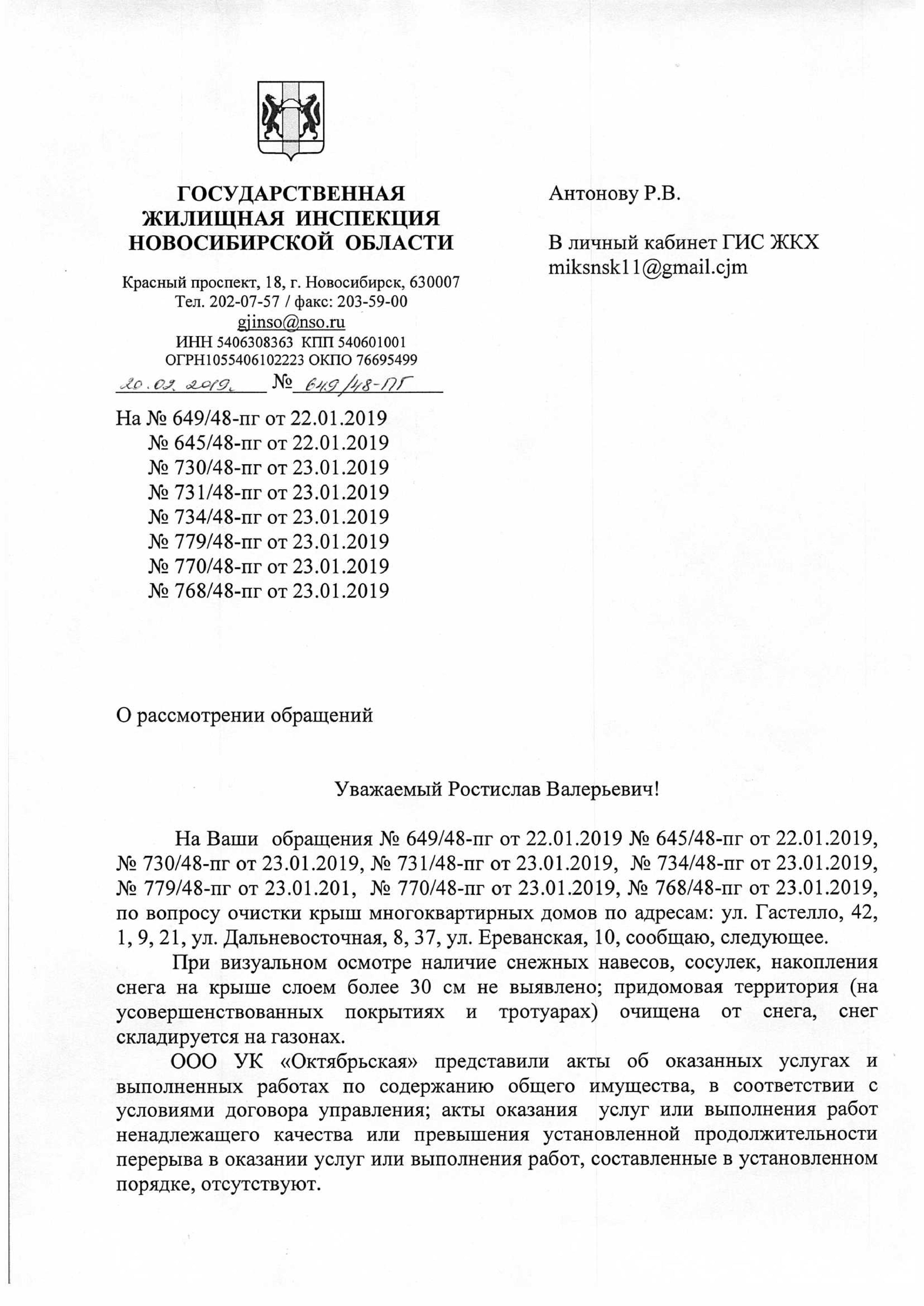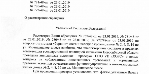 Номер жалобы:48478 Тип жалобы:Иные проблемы ЖКХ Название объекта: Регион:Новосибирская область Город:Новосибирск Адрес:Мочищенское шоссе, 4 Описание жалобы:УК