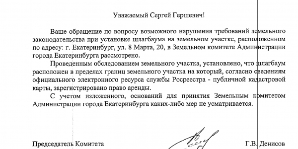 Номер жалобы:48493 Тип жалобы:Иные проблемы ЖКХ Название объекта: Регион:Свердловская область Город:Екатеринбург Адрес:Екатеринбург, улица 8 Марта, 20 Описание жалобы:Не санкционированный шлакбаум. Прошу разобраться Статус: