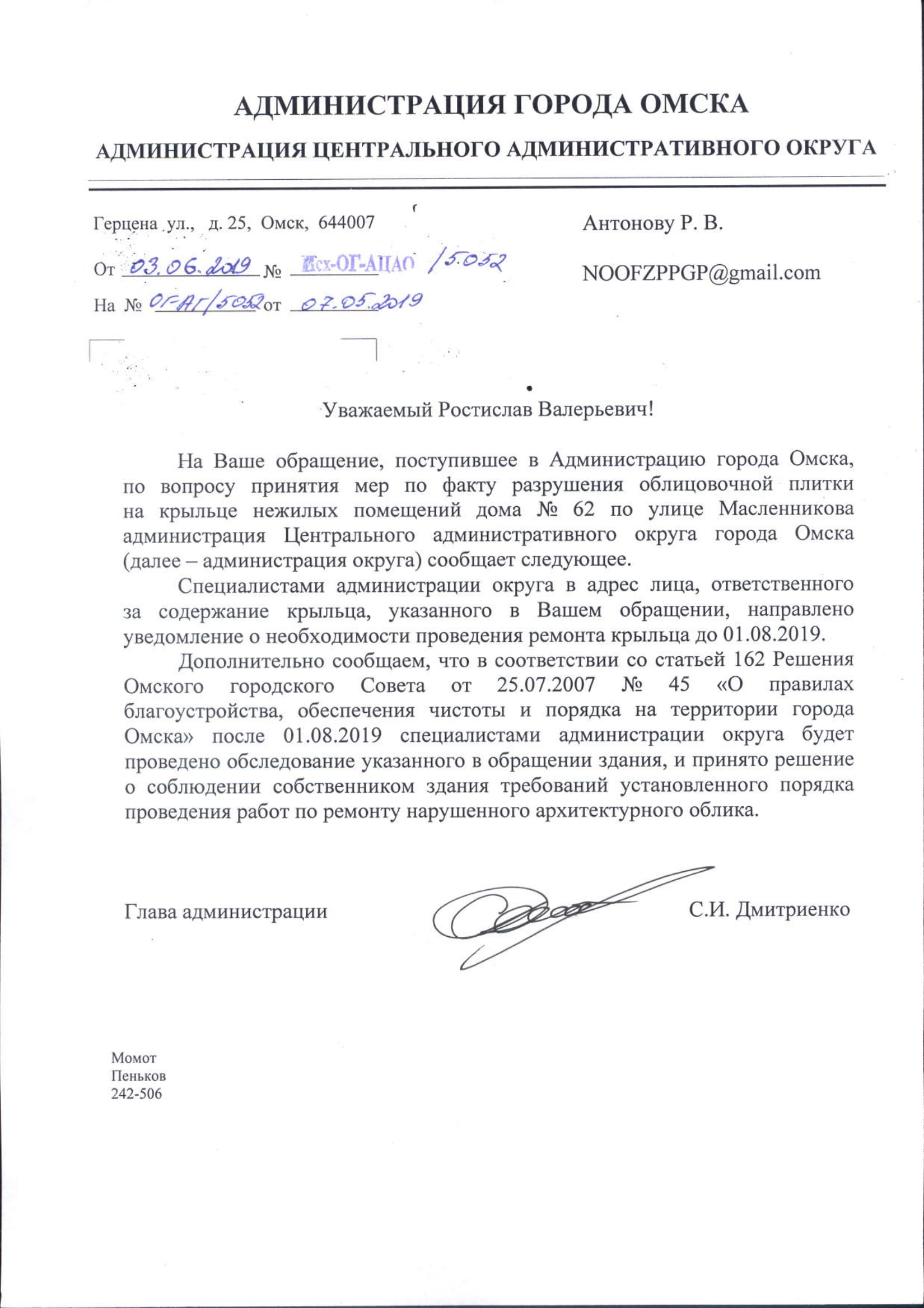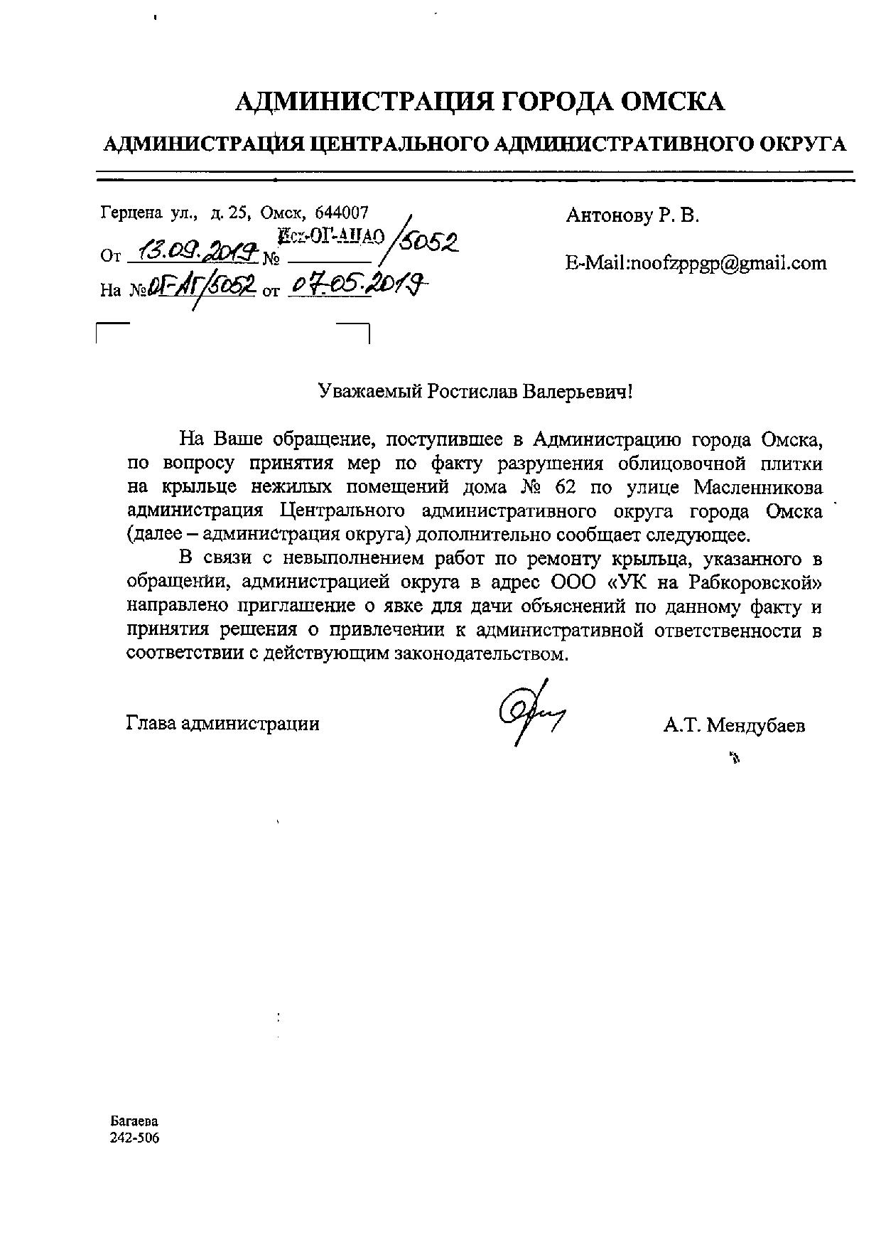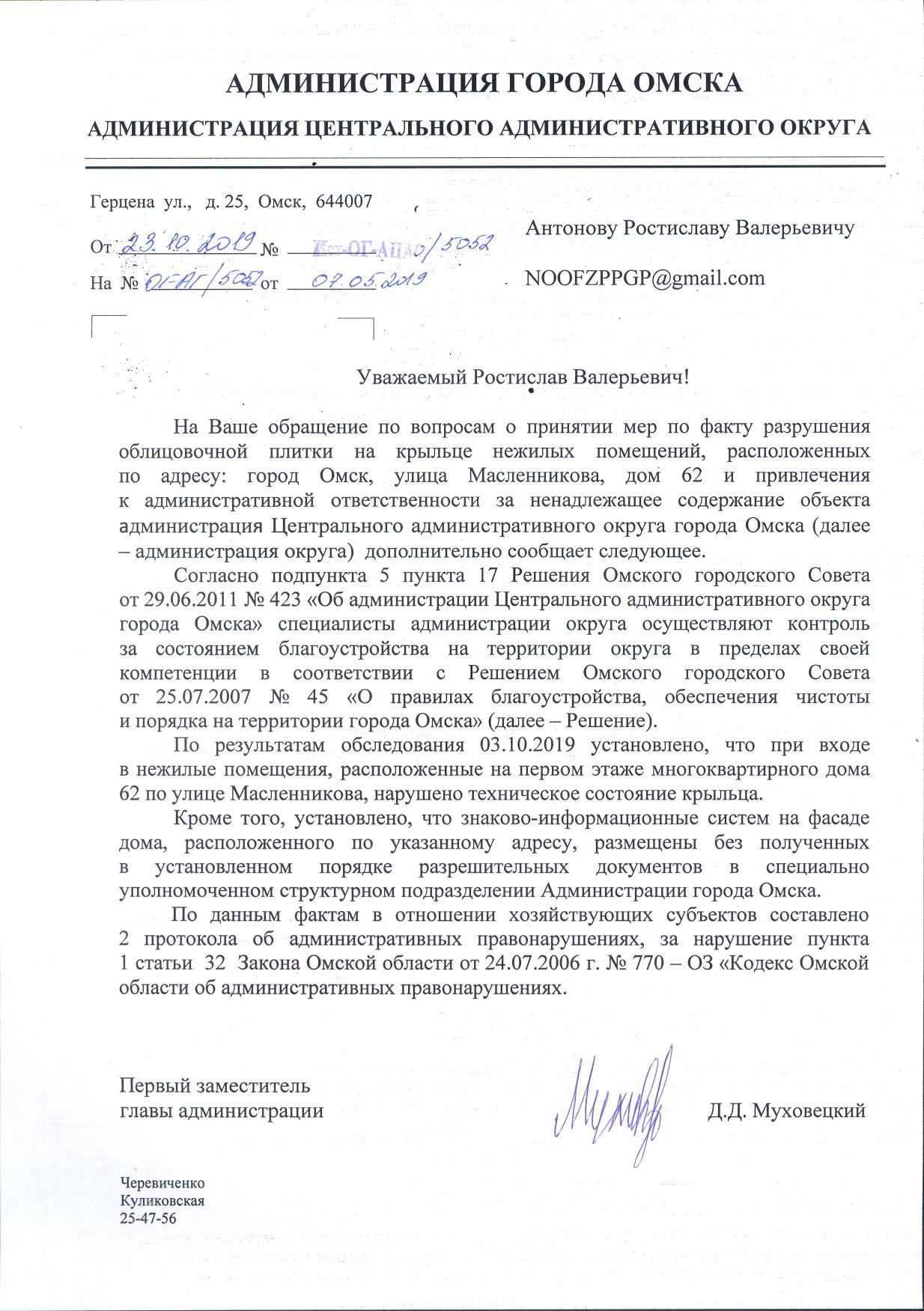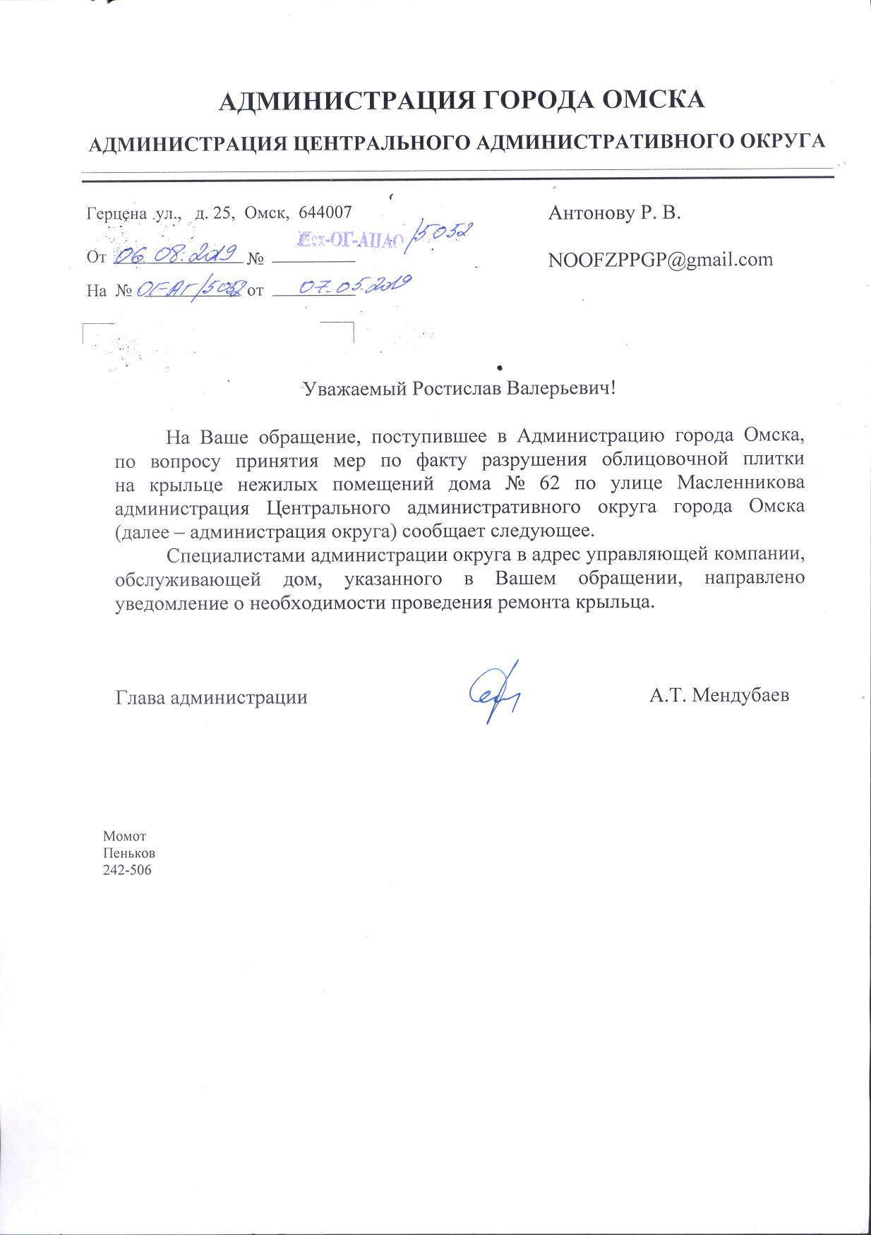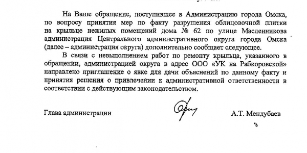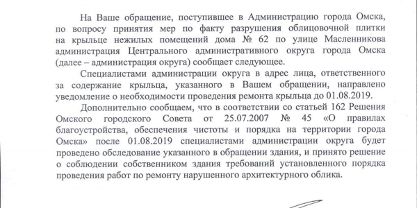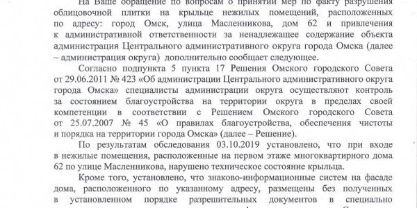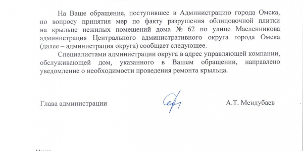 Номер жалобы:54321 Тип жалобы:Прочее Название объекта: Регион:Омская область Город:Омск Адрес:улица Масленникова, 62 Описание жалобы:Разрушение плитки Статус: