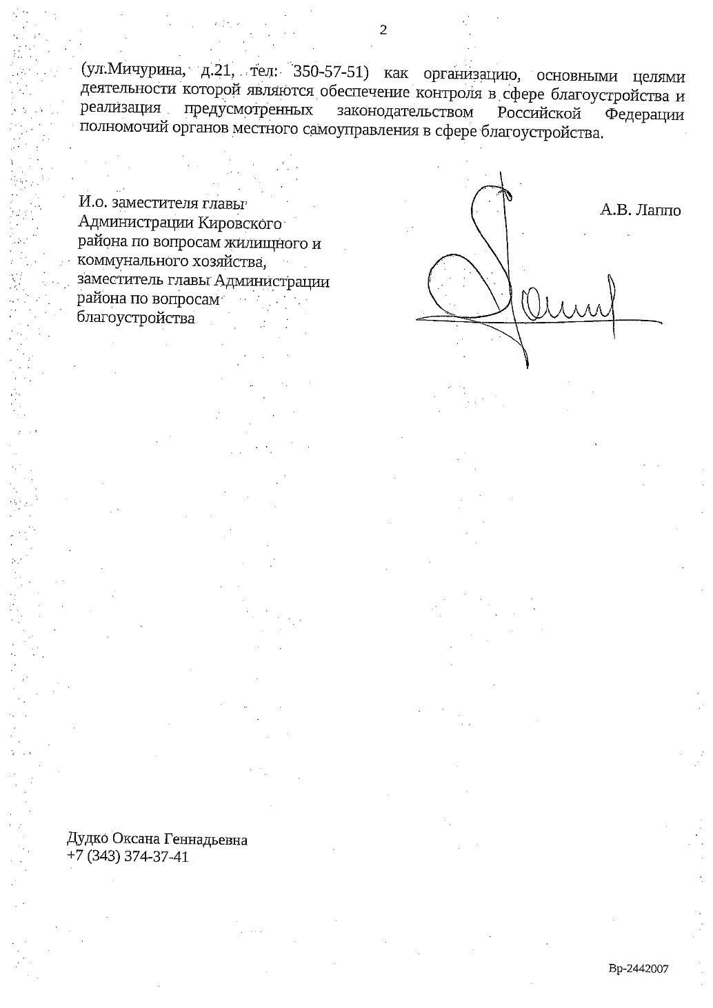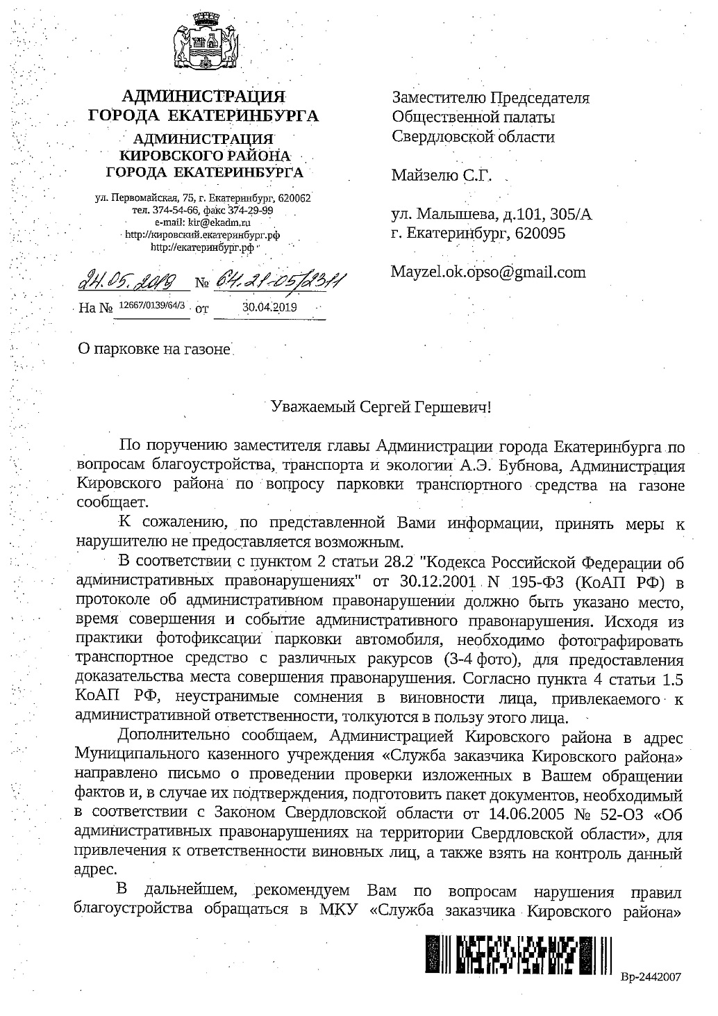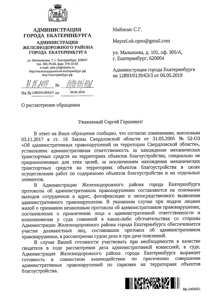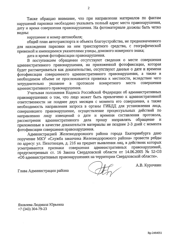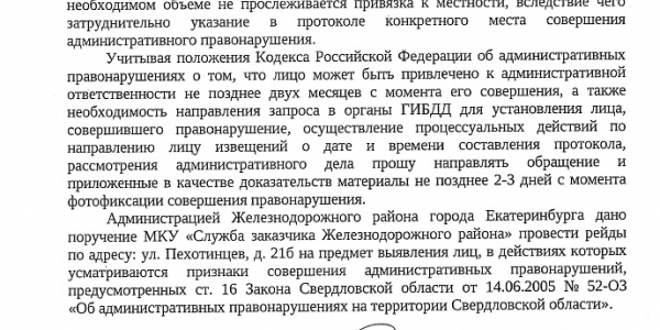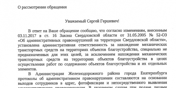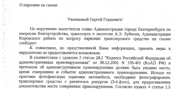 Номер жалобы:54325 Тип жалобы:Прочее Название объекта: Регион:Свердловская область Город:Екатеринбург Адрес:улица Пехотинцев, 21Б Описание жалобы:Парковка автомобиля Дэу Р210КТ/96 на газоне Статус: