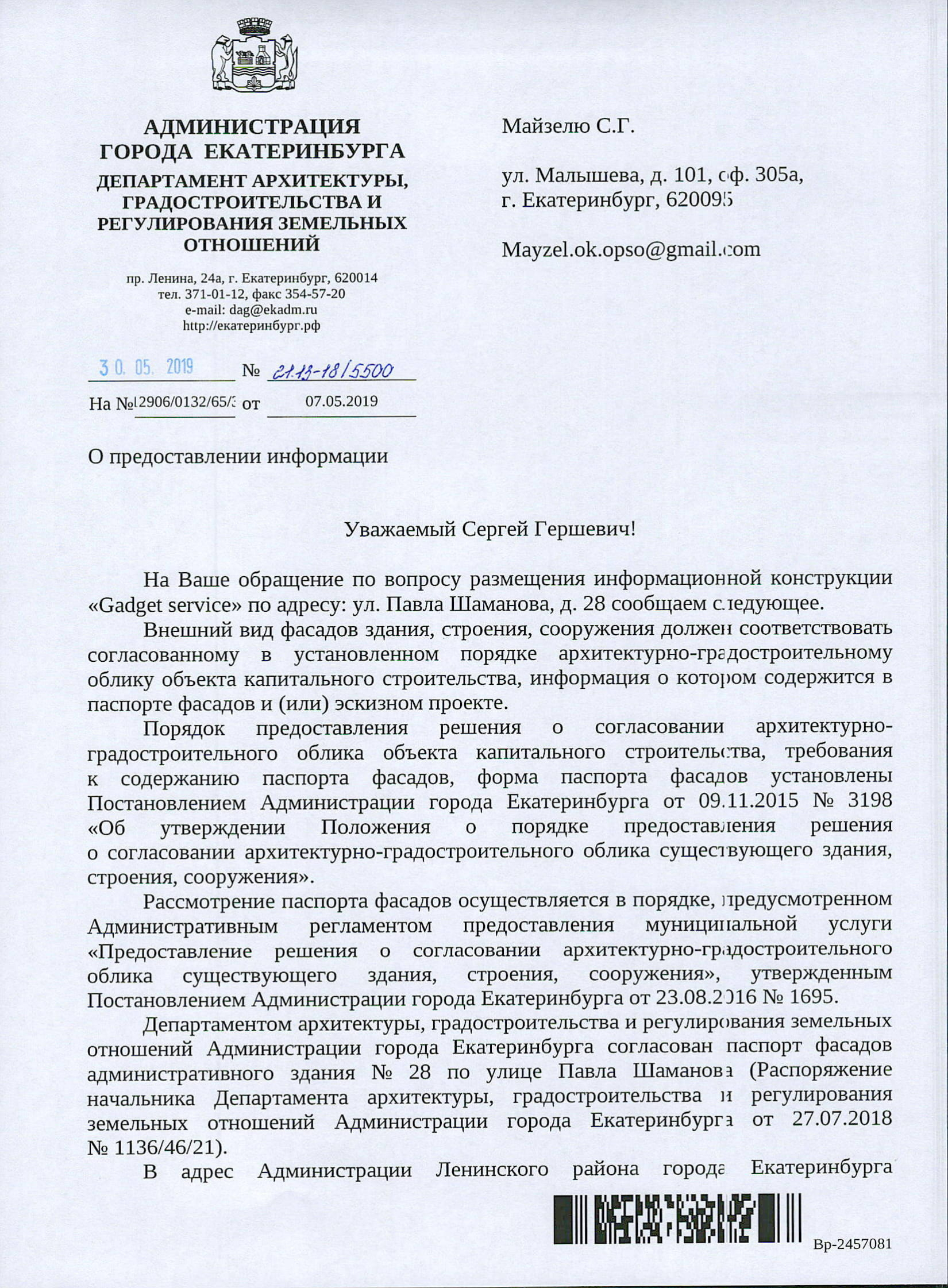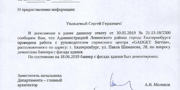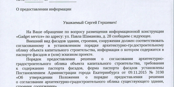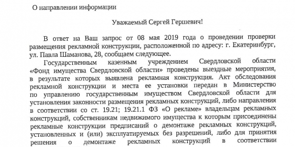 Номер жалобы:54346 Тип жалобы:Прочее Название объекта: Регион:Свердловская область Город:Екатеринбург Адрес:улица Павла Шаманова, 28 Описание жалобы:Незаконно висящий Рекламный банер Статус: