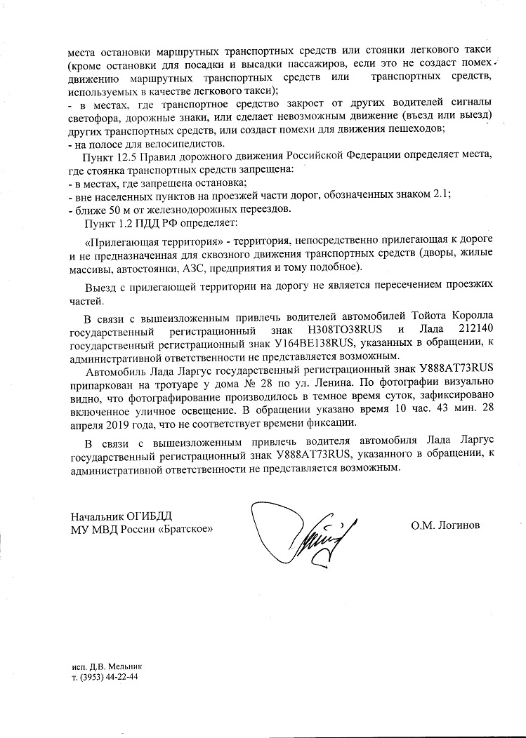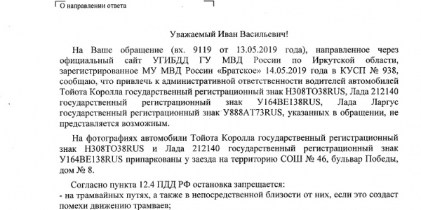 Номер жалобы:54310 Тип жалобы:Прочее Название объекта: Регион:Иркутская область Город:Братск Адрес:проспект Ленина, 28 Описание жалобы:Парковка на тротуаре. 27.04.2019г. 21:10 Статус: