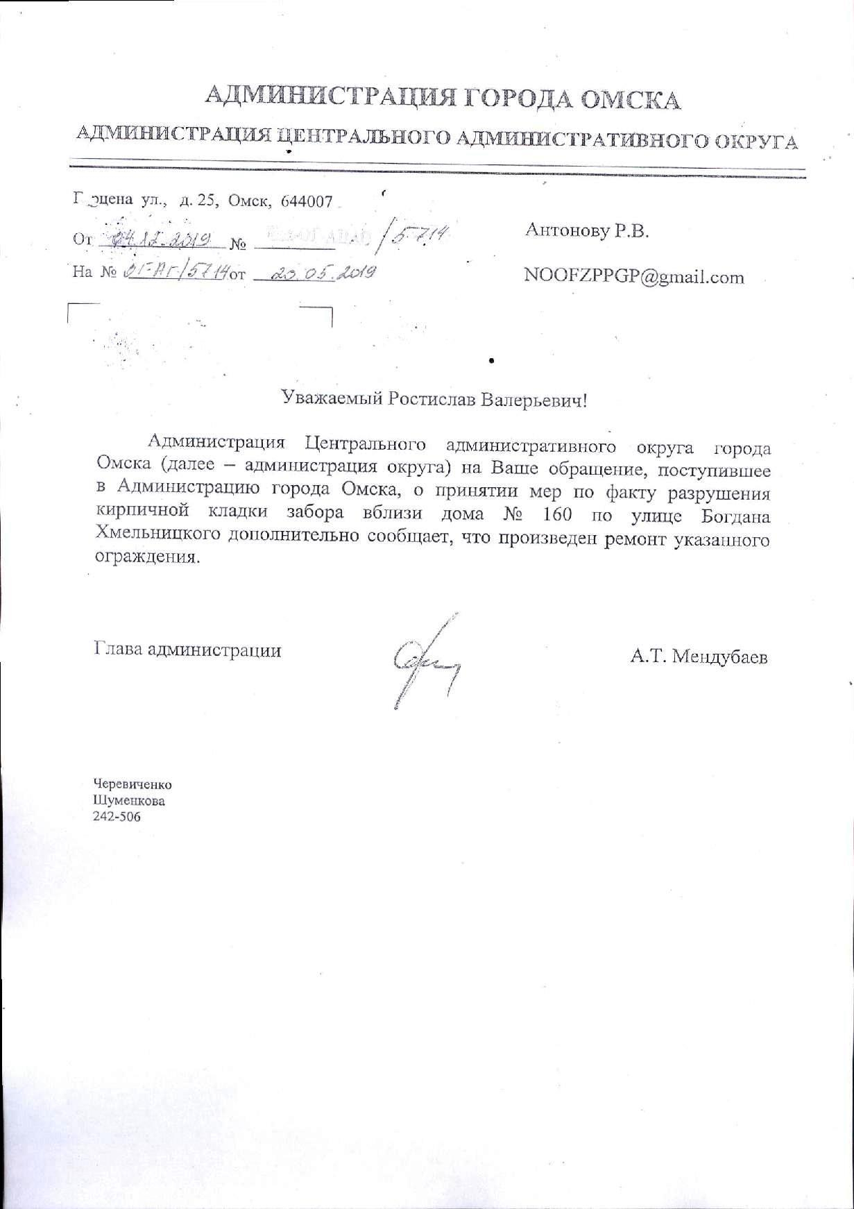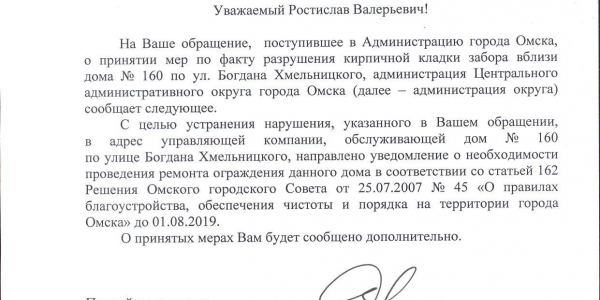 Номер жалобы:48384 Тип жалобы:Городская среда Название объекта: Регион:Омская область Город:Омск Адрес:ул. Богдана Хмельницкого, 160 Описание жалобы:разрушение кирпичной кладки забора Статус: