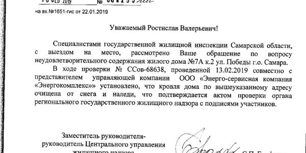 Номер жалобы:48397 Тип жалобы:Городская среда Название объекта: Регион:Самарская область Город:Самара Адрес:ул. Победы, 7а к2 Описание жалобы:Ул. Победы 7а корпус 2 - висят глыбы льда,вода сочится по перекрытиям на чердак и затапливает квартиры на 5- м этаже. Ук ООО ЭСКО Энергокомплекс на просьбы очистить крышу от снега и наледи не реагирует. Статус: