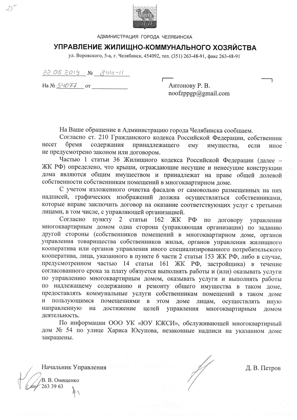 Номер жалобы:54077 Тип жалобы:Прочее Название объекта: Регион:Челябинская область Город:Челябинск Адрес:улица Хариса Юсупова, 54 Описание жалобы:844-11 Реклама наркотиков на торце дома Статус: