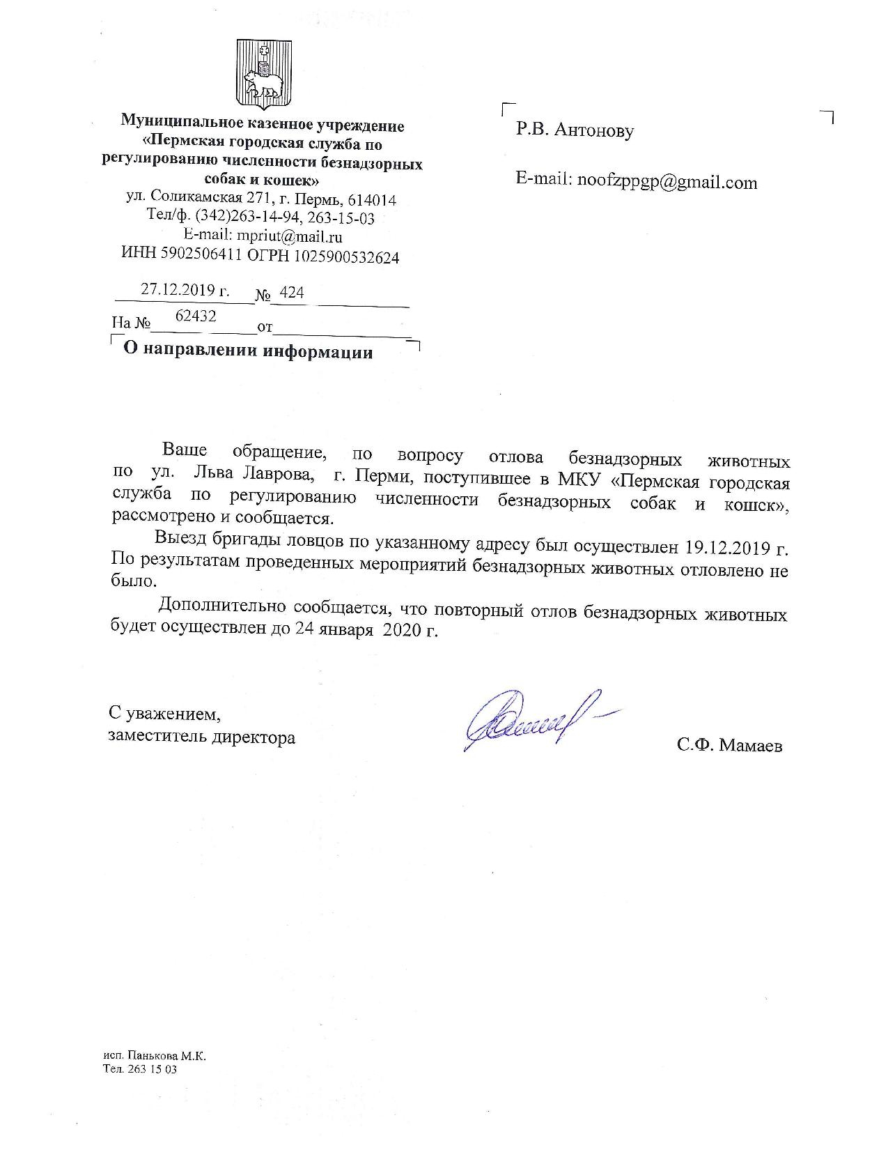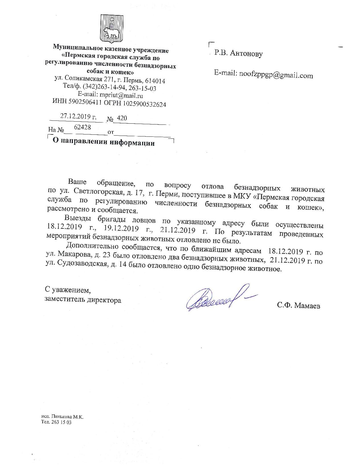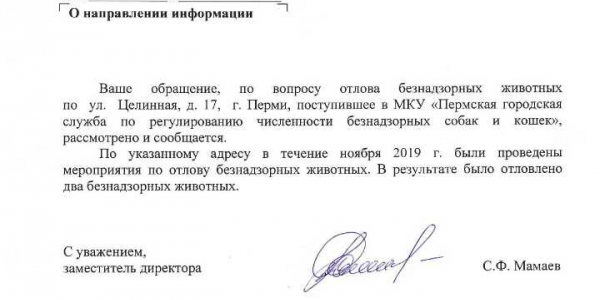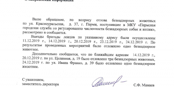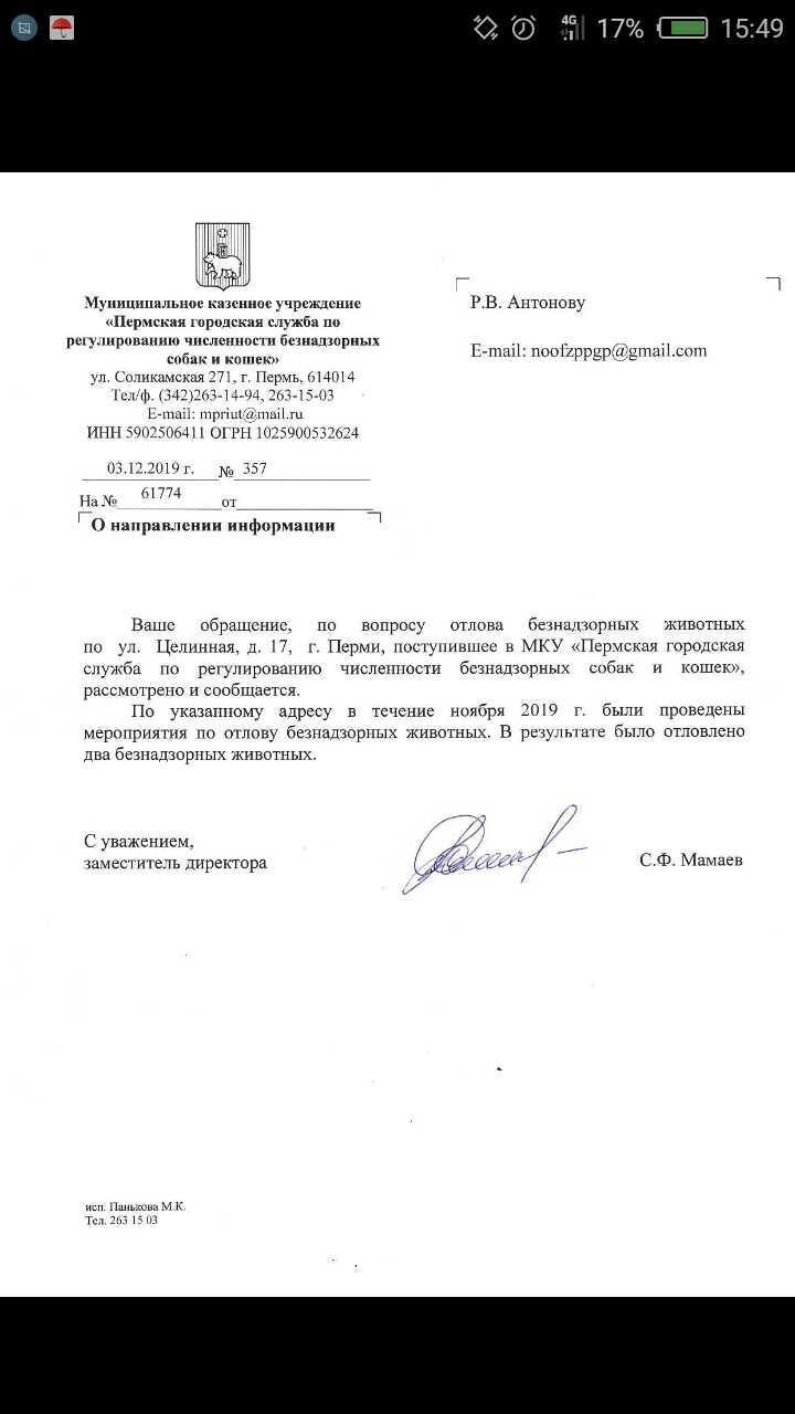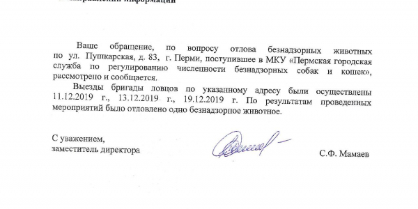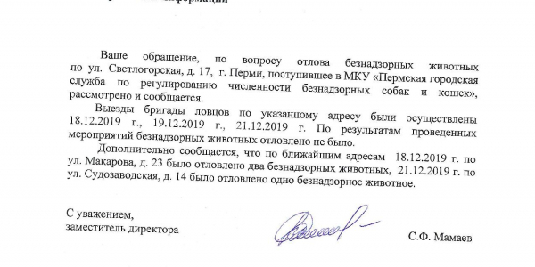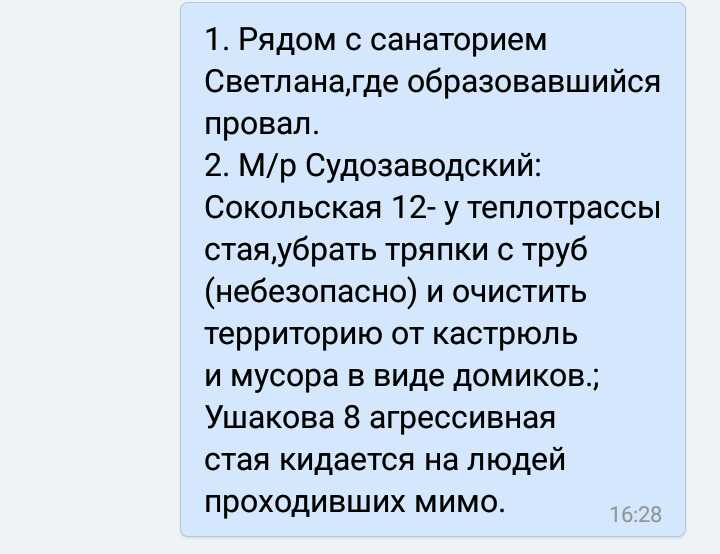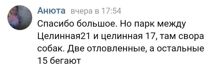 https://go.2gis.com/pnrv2 ) пришел ранее ответ,что отловлено 2собаки,но заявитель указал, что остальные 15 остались на месте. Просим убрать всех остальных, ради безопасности себя и детей. Статус: