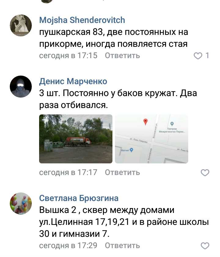 Номер жалобы:62430 Тип жалобы:Безнадзорные животные Название объекта: Регион:Пермский край Город:Пермь Адрес:Пушкарская улица, 83 Описание жалобы:пушкарская 83, две собаки постоянных на прикорме, иногда появляется стая Статус: