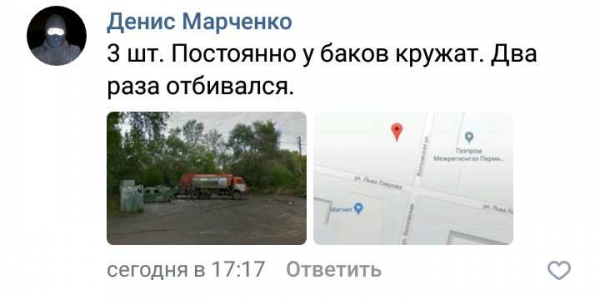 Номер жалобы:62432 Тип жалобы:Безнадзорные животные Название объекта: Регион:Пермский край Город:Пермь Адрес:улица Льва Лаврова Описание жалобы:Собаки 3шт. Постоянно у баков кружат. 2раза отбивался.