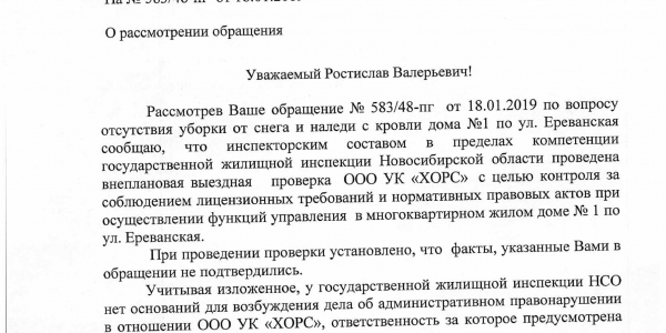 Номер жалобы:48328 Тип жалобы:Иные проблемы ЖКХ Название объекта: Регион:Новосибирская область Город:Новосибирск Адрес:Ереванская улица, 1 Описание жалобы:Снег на крыше дома Статус: