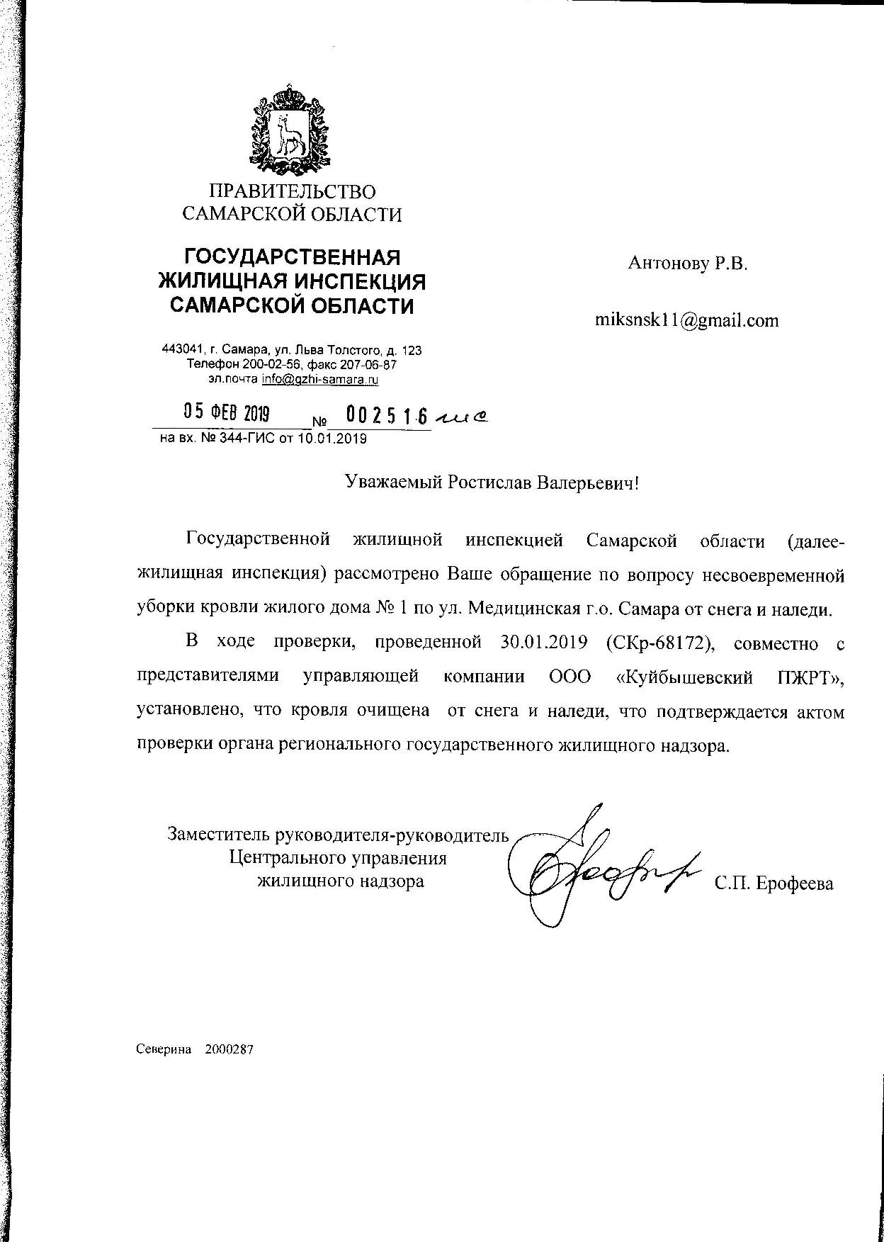 Номер жалобы:47959 Тип жалобы:Городская среда Название объекта: Регион:Самарская область Город:Самара Адрес:ул.Медицинская, 1 Описание жалобы:плохая уборка снега с крыши и сосульки Статус: