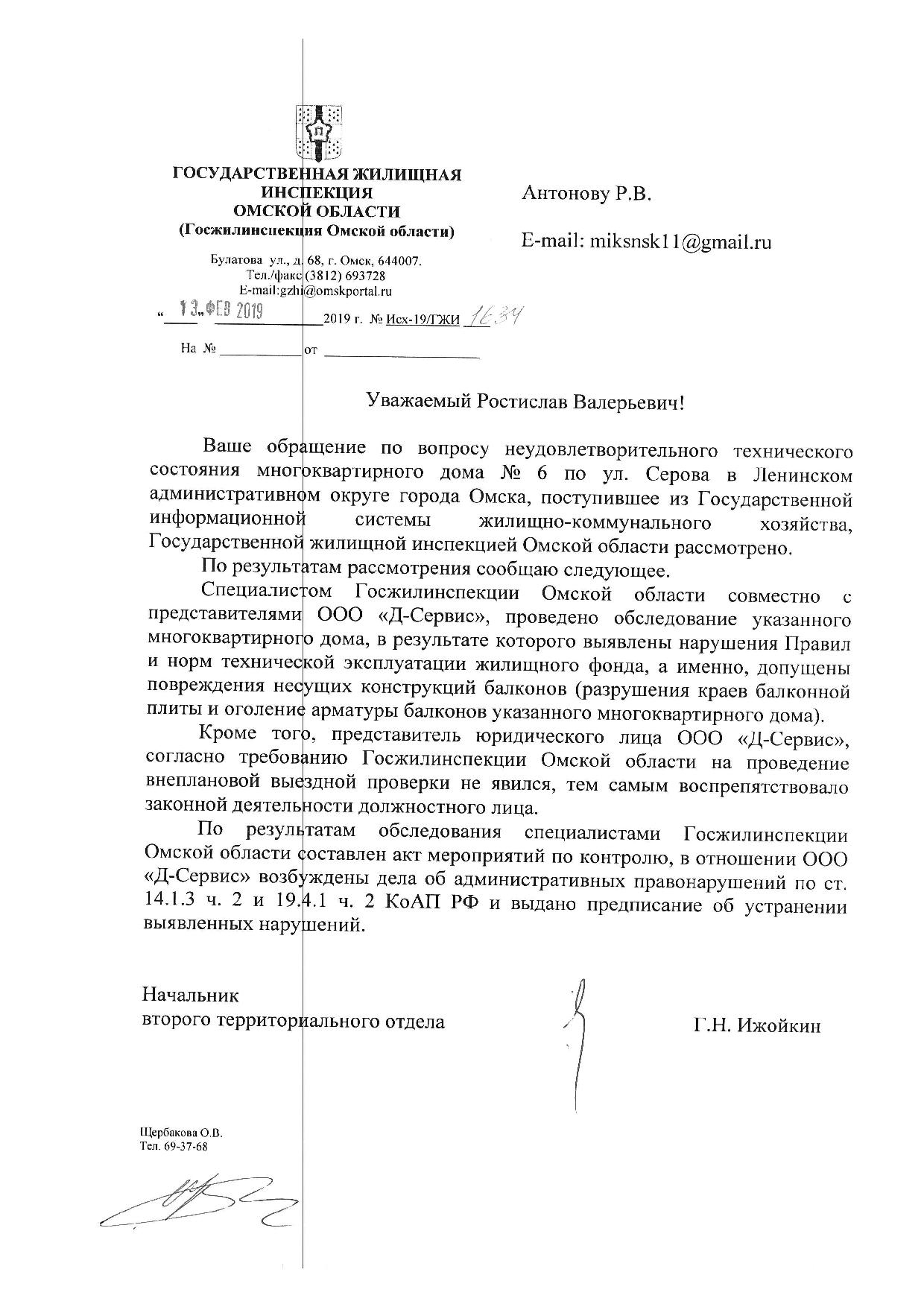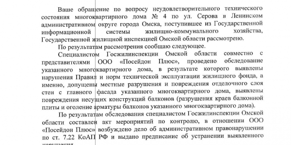 Номер жалобы:48181 Тип жалобы:Здания / строительство (здание не приспособлено для инвалидов, нет ограждения при строительстве и т.д.) Название объекта: Регион:Омская область Город:Омск Адрес:ул. Серова, 4 Описание жалобы:Разрушение фундамента жилого дома, балкона и других элементов фасада Статус: