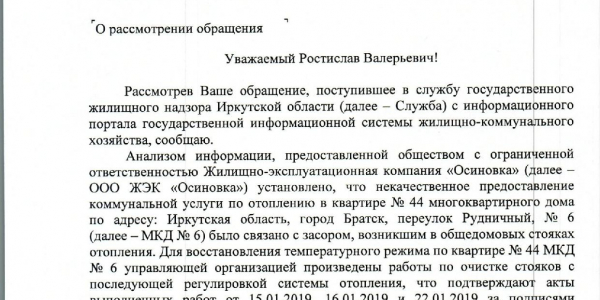 Номер жалобы:47968 Тип жалобы:Иные проблемы ЖКХ Название объекта:ЖЭК Осиновка Регион:Иркутская область Город:Братск Адрес:пер. Рудничный 6 Описание жалобы:В квартирах холодина. Батареи холодные. Акт замеров температуры сделан. Куча обещаний от руководителей ЖЭК разного уровня. Полтора месяца никаких движений.