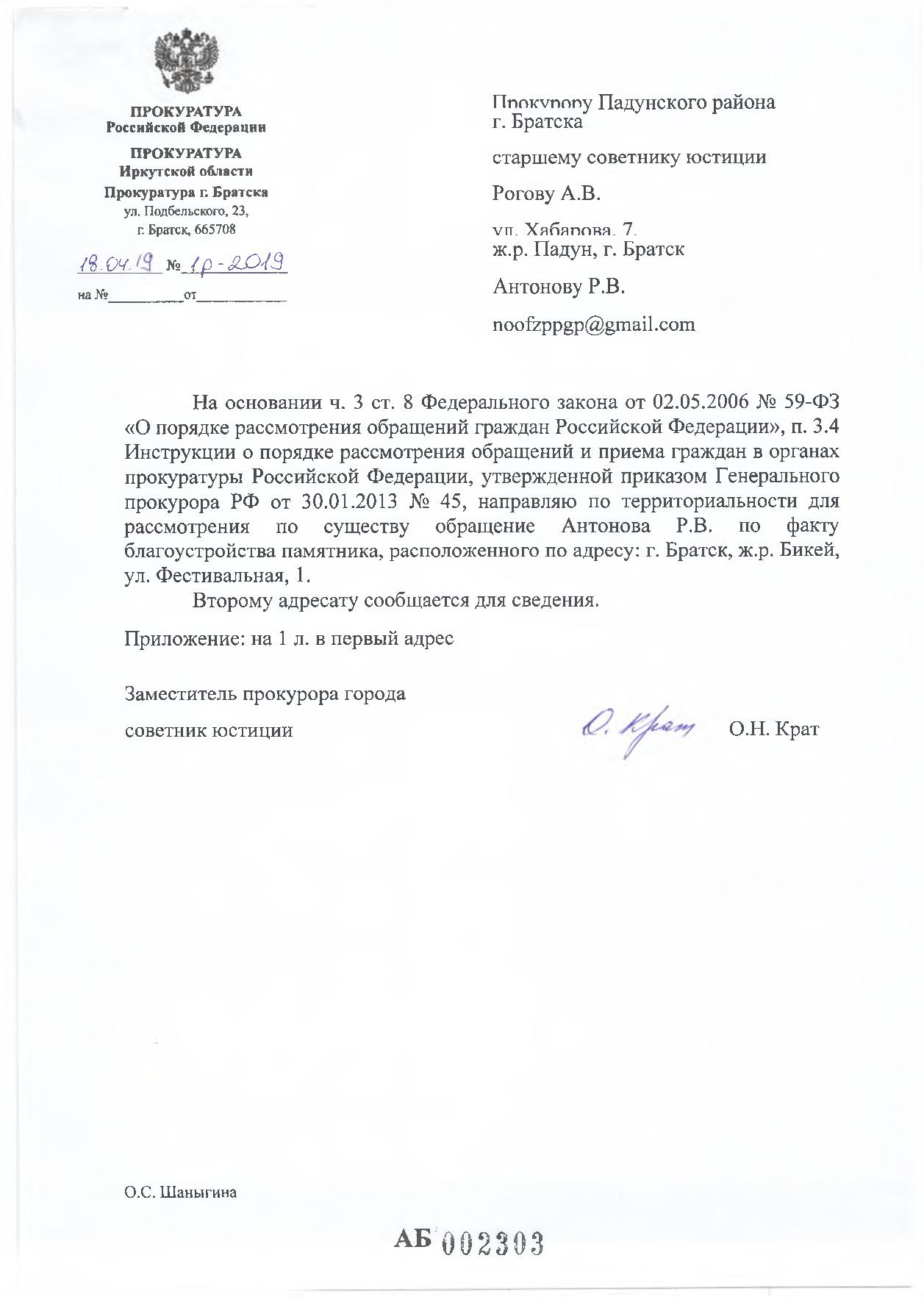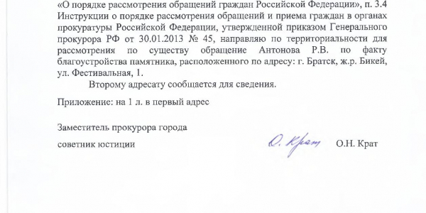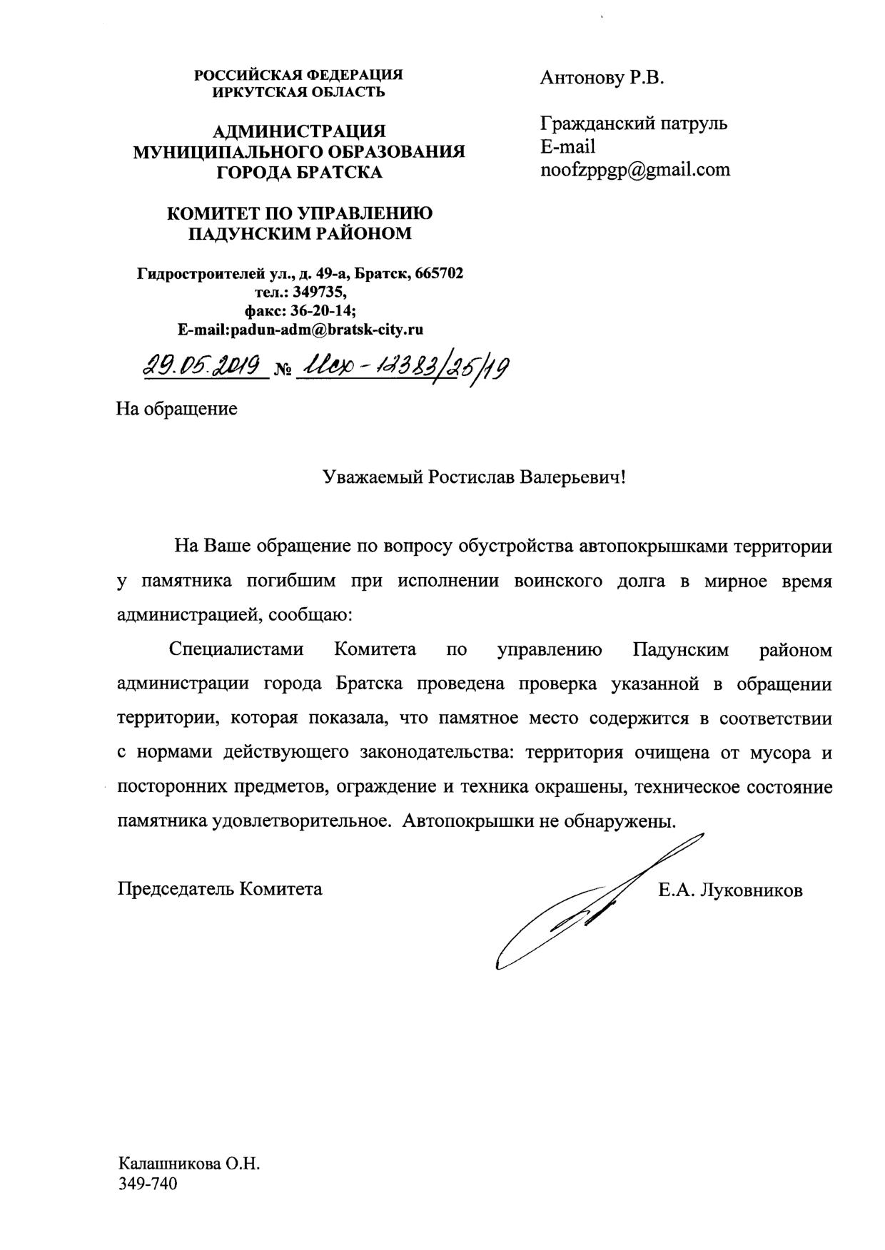 Номер жалобы:53400 Тип жалобы:Прочее Название объекта: Регион:Иркутская область Город:Братск Адрес:ул. Фестивальная, 1 Описание жалобы:Памятник погибшим при исполнении воинского долга в мирное время благоустроен вазонами из покрышек. В близи здания по адресу ул. Фестивальная 1. Статус:
