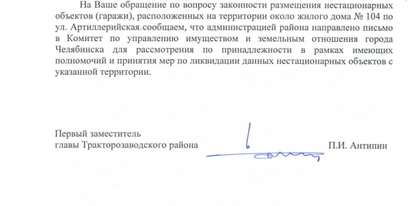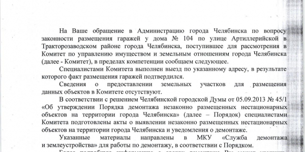 Номер жалобы:53346 Тип жалобы:Прочее Название объекта: Регион:Челябинская область Город:Челябинск Адрес:ул. Артиллерийская, д. 104 Описание жалобы:681-3 Законность металлических гаражей, расположенных на придомовой территории по адресу г. Челябинск, ул. Артиллерийская, д. 104. Эти гаражи расположены почти на детской площадке. Дети постоянно залезают и бегают по крышам. Между гаражами всегда горы пакетов с мусором. Недобросовестные граждане выбрасывают между гаражами что попало. Статус: