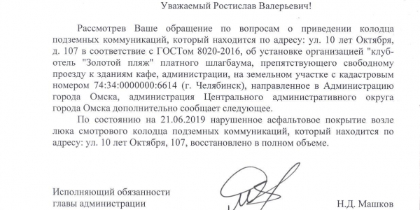 Номер жалобы:53481 Тип жалобы:Прочее Название объекта: Регион:Омская область Город:Омск Адрес:улица 10 лет Октября, 107 Описание жалобы:В районе дома 107 на дороге возле пересечения с улицей 4-я линия, разрушение асфальта вокруг люка. Это может стать причиной аварийной ситуации. Надо срочно заделать яму