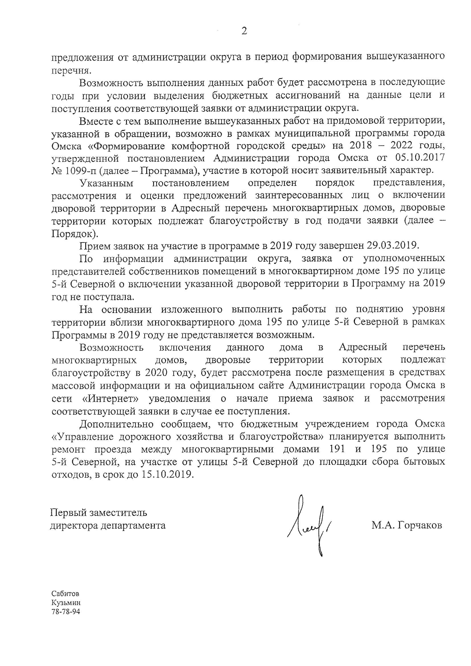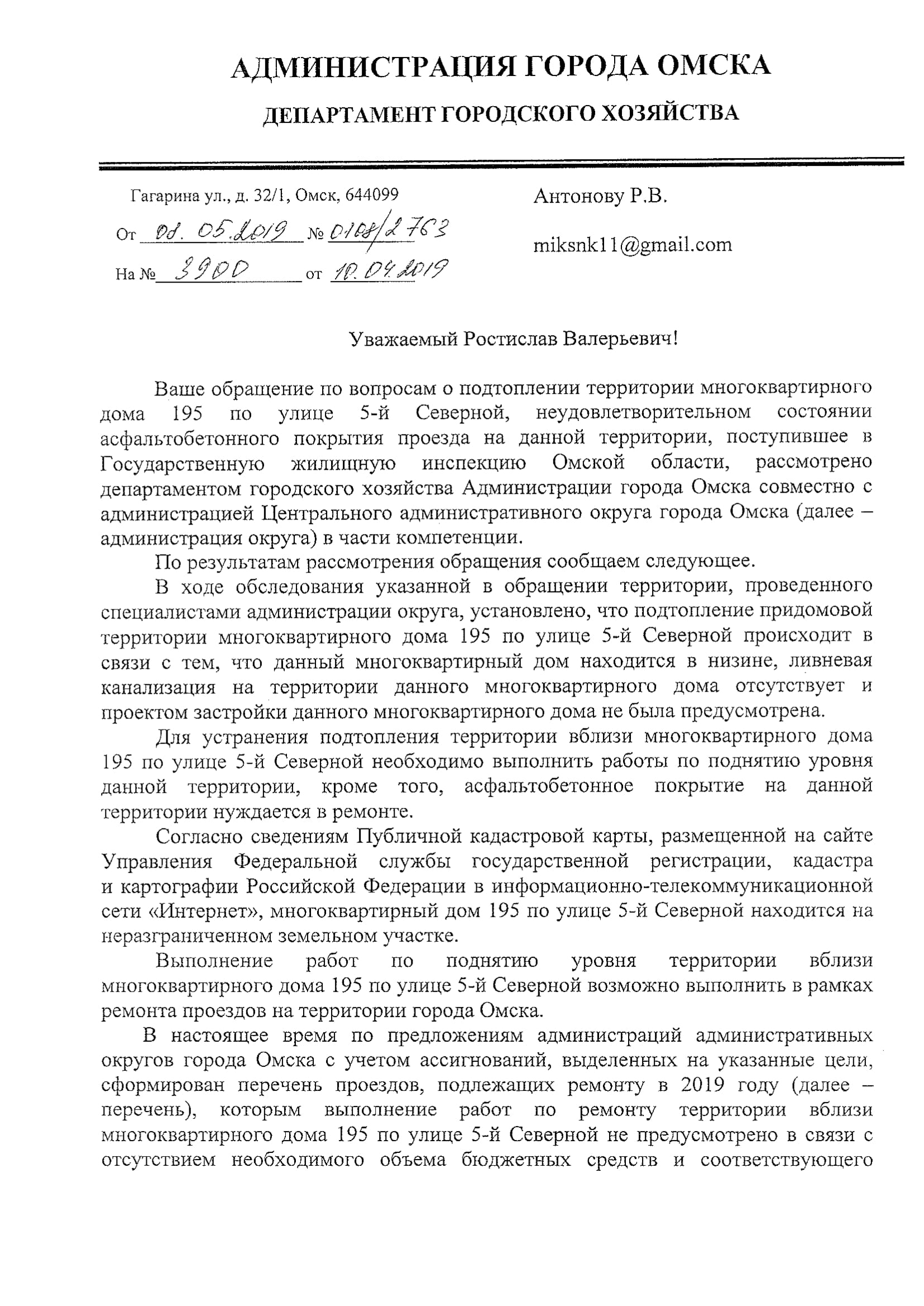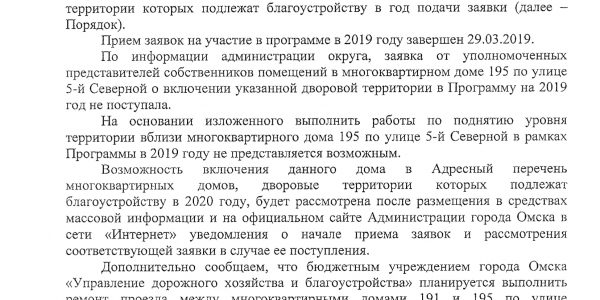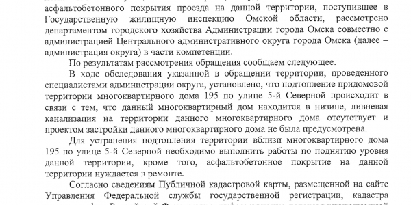 Номер жалобы:53082 Тип жалобы:Прочее Название объекта: Регион:Омская область Город:Омск Адрес:5-я Северная улица, 195 Описание жалобы:На протяжении многих лет двор завален грязью и мусором. Весной и осенью скапливается много воды и образуется грязь вокруг. Весь асфальт вокруг в рытвинах и ямах, будто после бомбардировки. Очень сложно даже элементарно дойти до магазина, не говоря уже о чем то другом. В домах живет очень много стариков и детей. Несмотря на постоянные и многочисленные обращения, УК бездействует, как вы видите. Вот уже около 30 лет ничего не меняется, ситуация всегда одна и та же. Статус:
