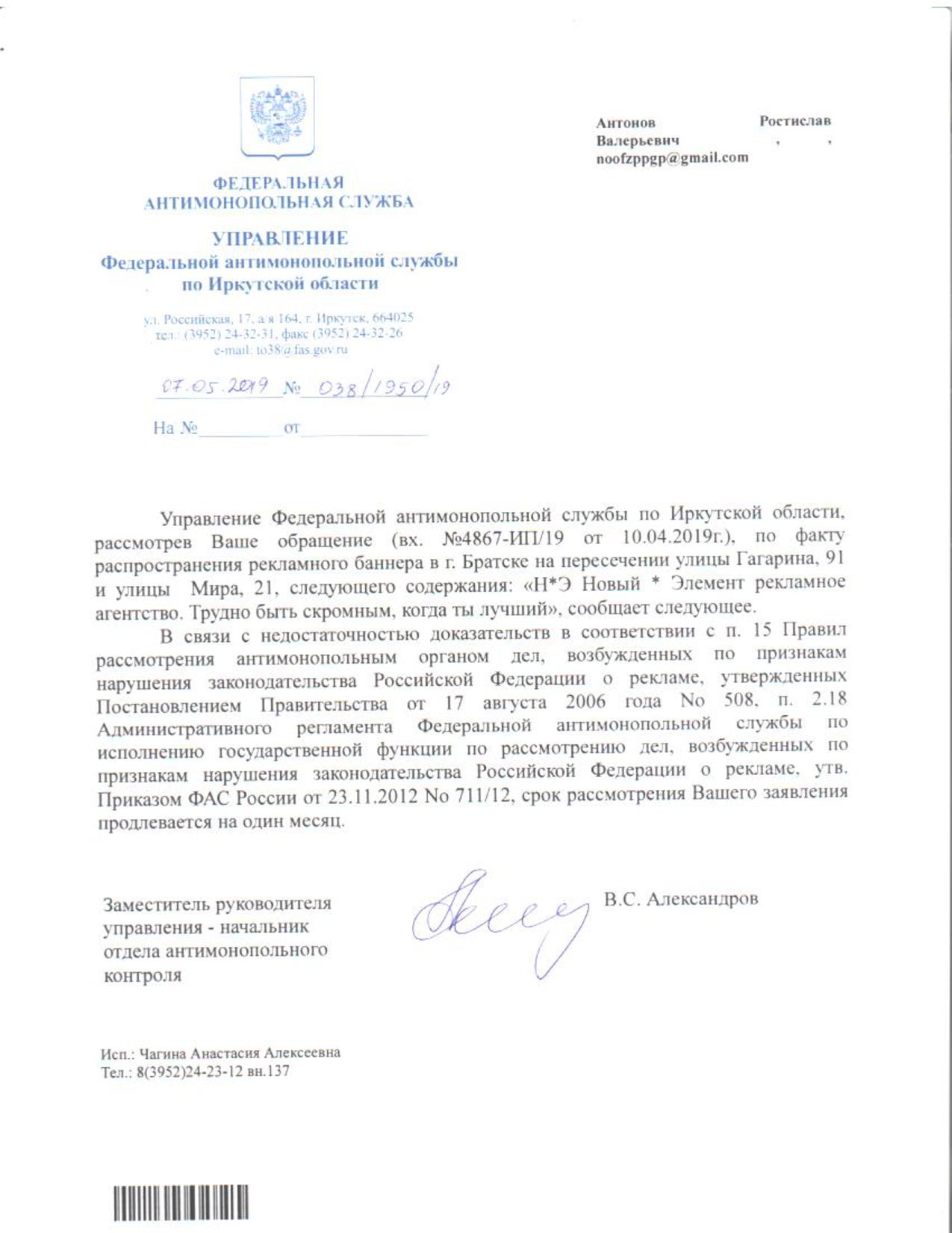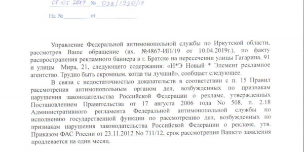 Номер жалобы:53183 Тип жалобы:Прочее Название объекта: Регион:Иркутская область Город:Братск Адрес:улица Гагарина, 91 Описание жалобы:УФАС