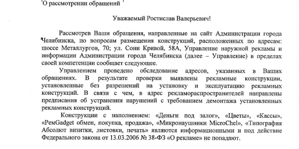 Номер жалобы:53037 Тип жалобы:Прочее Название объекта: Регион:Челябинская область Город:Челябинск Адрес:шоссе Металлургов, 70 Описание жалобы:Просьба проверить законность рекламы на данных магазинах Статус: