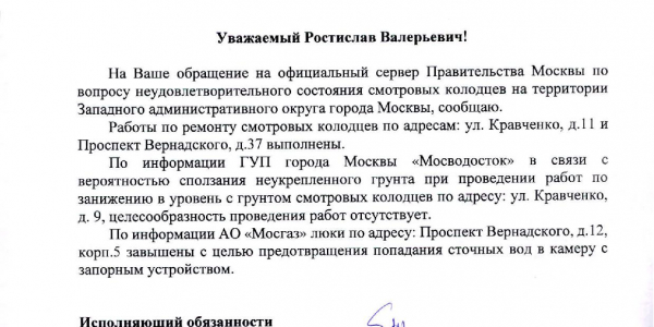 Номер жалобы:53067 Тип жалобы:Прочее Название объекта: Регион:Москва Город:Москва Адрес:проспект Вернадского, 12к5 Описание жалобы:Нужно занизить колодцы. В ложбине за прудом согласно геометке. Статус: