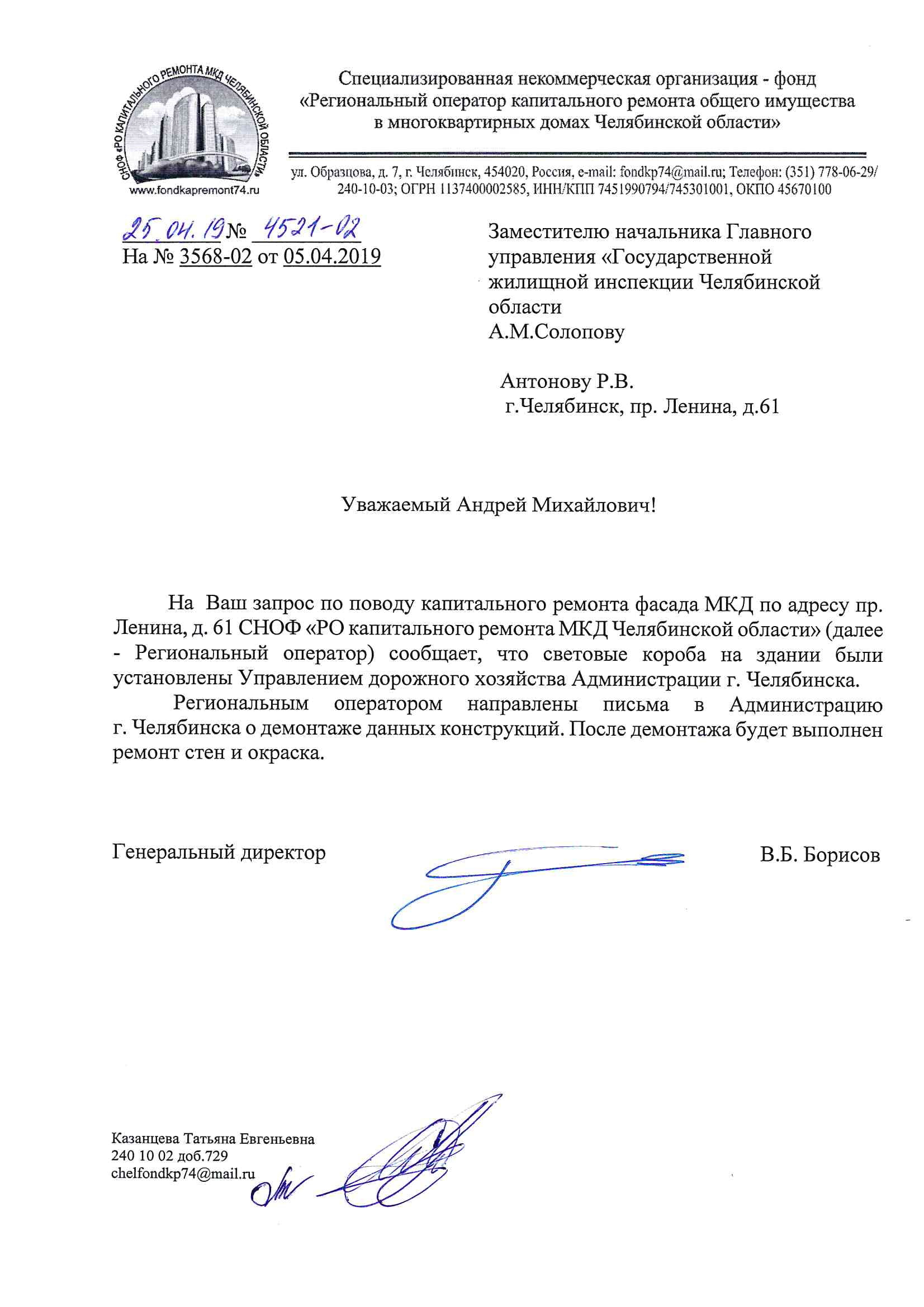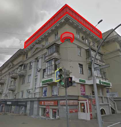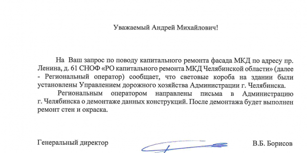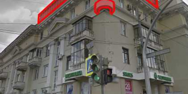 Пр-т Ленина, 61 — идёт капитальный ремонт фасада, но при этом до сих пор не сняты полуразобранные световые рекламные короба, которые висят там уже несколько лет. 2 огромных угловых световых короба на обоих углах в верхней части здания, 1 вертикальный световой короб и 1 рекламная конструкция в виде кольца. Необходимо их демонтировать и провести качественный ремонт и покраску фасада. Статус: