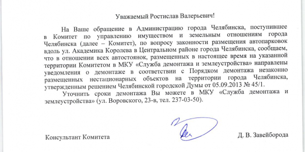 Номер жалобы:52973 Тип жалобы:Прочее Название объекта: Регион:Челябинская область Город:Челябинск Адрес:ул. Академика Королева Описание жалобы:Прошу проверить законность всех автостоянок на ул. Академика Королева. Занимают огромные площади, где должны быть тротуары и зоны для прогулок. Статус: