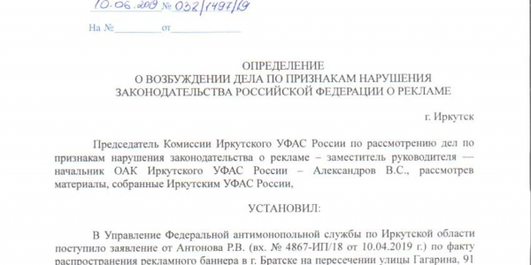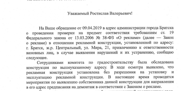 Номер жалобы:52994 Тип жалобы:Прочее Название объекта: Регион:Иркутская область Город:Братск Адрес:улица Мира, 21 Описание жалобы:+ отправлена в УФАС