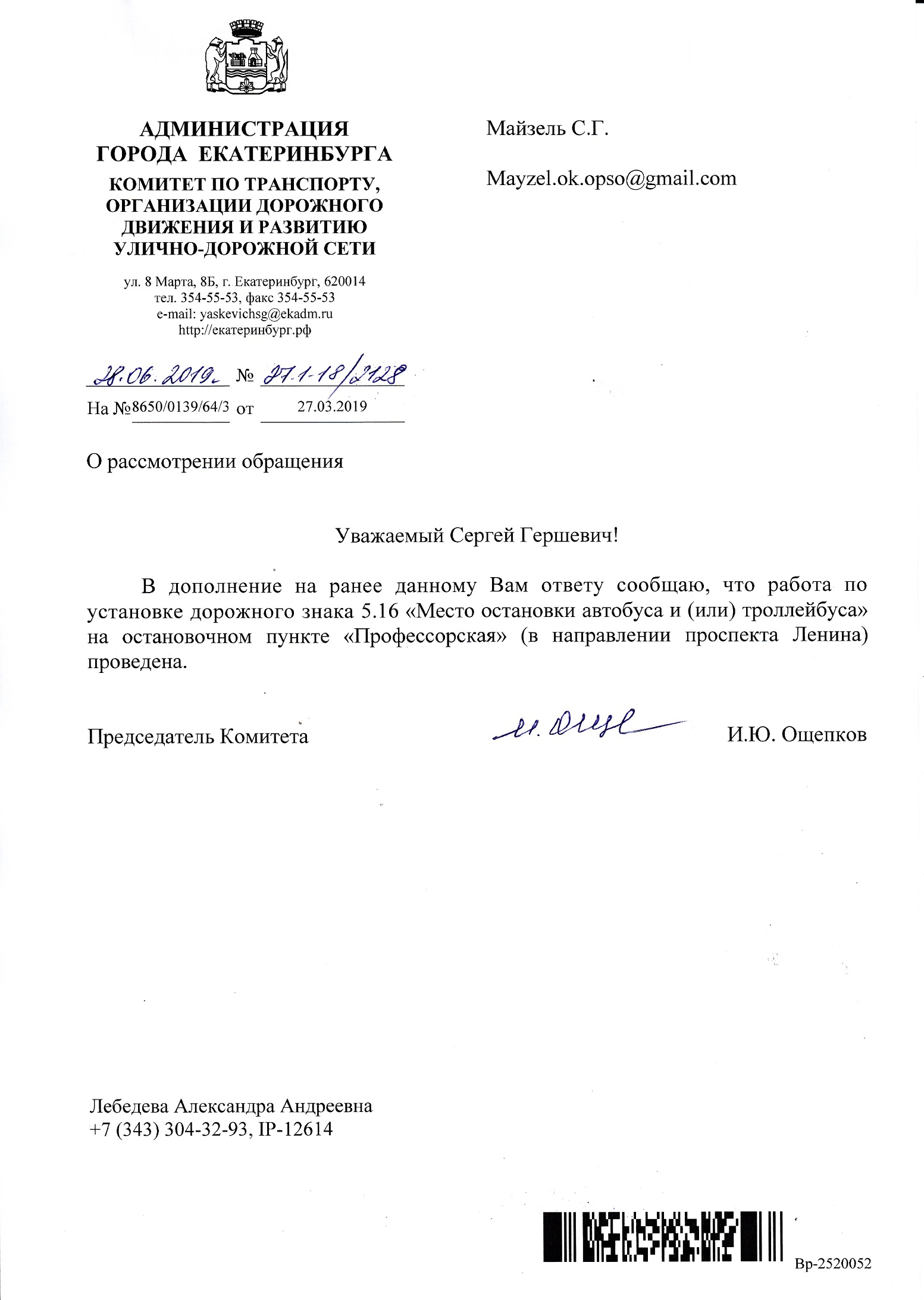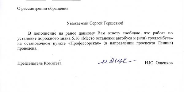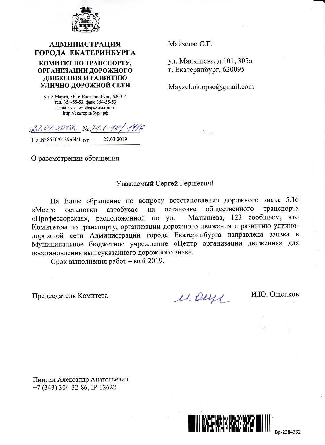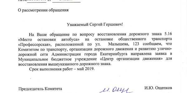 Номер жалобы:52285 Тип жалобы:Прочее Название объекта:Мэрия Регион:Свердловская область Город:Екатеринбург Адрес:улица Малышева, 123 Описание жалобы:Отсутствует знак 5.16 «место остановки автобуса» на автобусной остановке «Профессорская» в направлении проспекта Ленина. Статус: