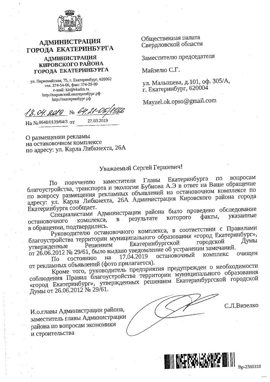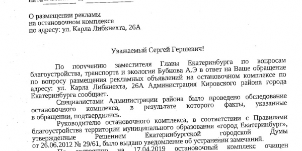 Номер жалобы:52350 Тип жалобы:Прочее Название объекта: Регион:Свердловская область Город:Екатеринбург Адрес:улица Карла Либкнехта, 26А Описание жалобы:реклама на остановочном комплексе Статус: