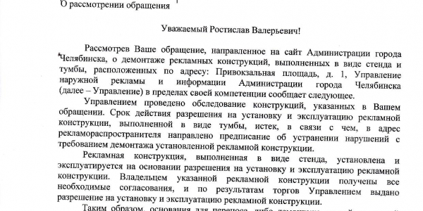Номер жалобы:52274 Тип жалобы:Прочее Название объекта: Регион:Челябинская область Город:Челябинск Адрес:улица Свободы Описание жалобы:На пешеходной зоне вблизи остановки ЖД вокзал, расположены рекламные конструкции, препятствующие нормальному передвижению пешеходов. Приходится обходить их, это не удобно.