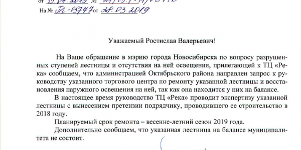 Номер жалобы:52358 Тип жалобы:Прочее Название объекта: Регион:Новосибирская область Город:Новосибирск Адрес:Большевистская улица, 45/1 Описание жалобы:Лестница не пригодна для эксплуатации. Ступени все сломаны и развалились. Нет освещения Статус:
