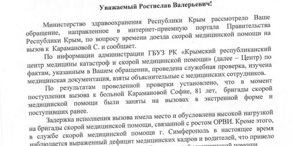 Номер жалобы:52394 Тип жалобы:Прочее Название объекта: Регион:Республика Крым Город:село Строгоновка Адрес:улица Хаджи Герай Описание жалобы:Ул. Хаджи Герай 15, Село Строгановка, скорая помощь добиралась к пожилой женщине с гипертоническим кризом 24.03.2019 три часа, вызов сделан в 19:00 скорая приехала в 22.00. Статус:
