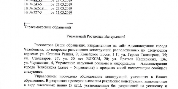 Номер жалобы:52280 Тип жалобы:Прочее Название объекта: Регион:Челябинская область Город:Челябинск Адрес:улица Степана Разина, 9 Описание жалобы:Незаконная реклама на фасаде Синегорья Статус: