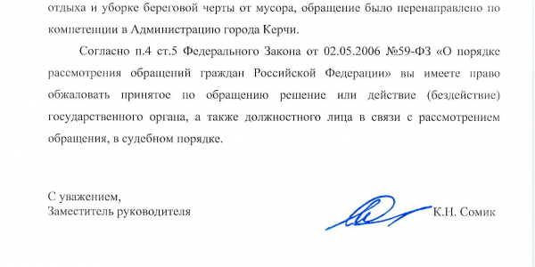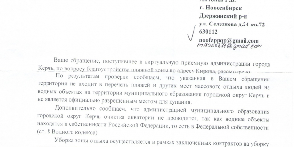 Номер жалобы:47458 Тип жалобы:Иные проблемы ЖКХ Название объекта: Регион:Республика Крым Город:Керчь Адрес:улица Кирова Описание жалобы:На городском пляже раскидан строительный мусор- бетонные блоки по кромке воды, прошу расчистить берег и акваторию пляжа, ржавчина уничтожила все мет. Конструкции на пляже, прошу заменить переодевалки, навесы, завести песок, увеличить территорию песчаного пляжа, провести уборку от водорослей, уборку проводить регулярно, вне зависимости от сезона.