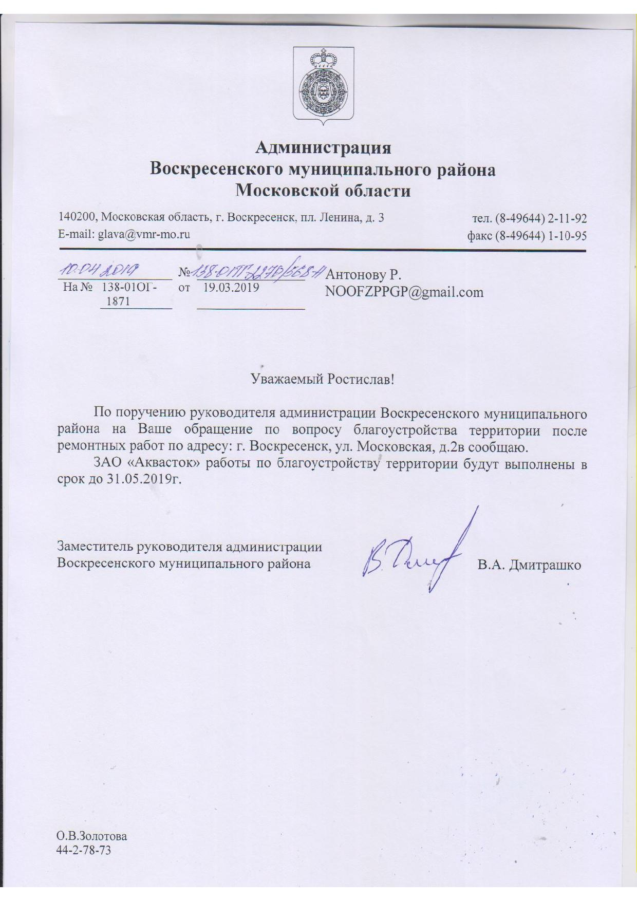 Номер жалобы:52115 Тип жалобы:Прочее Название объекта: Регион:Московская область Город:Воскресенск Адрес:Московская улица, 2В Описание жалобы:2 месяца уже Статус: