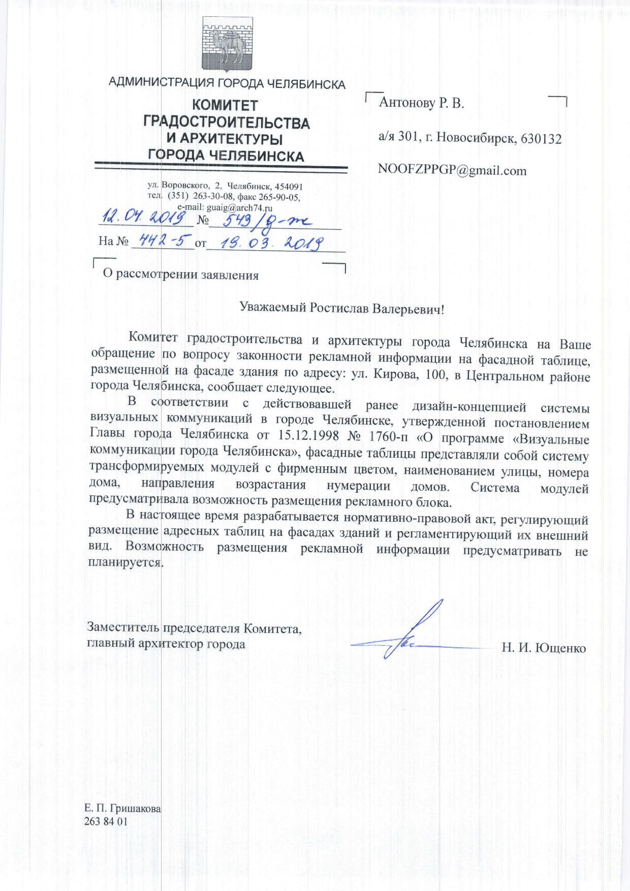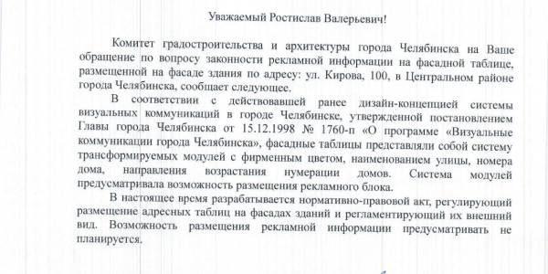 Номер жалобы:52119 Тип жалобы:Прочее Название объекта: Регион:Челябинская область Город:Челябинск Адрес:улица Кирова, 100 Описание жалобы:Незаконная реклама. Прошу поменять вывеску нумерации дома, без указания каких-либо организаций. Предлагаю хотябы на "Кировке" нумерацию домов сделать в едином, красивом стиле.