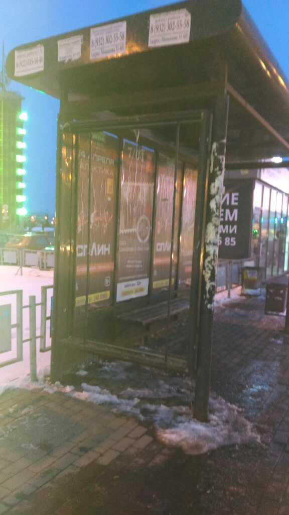 Номер жалобы:52120 Тип жалобы:Прочее Название объекта: Регион:Челябинская область Город:Челябинск Адрес:улица Свободы Описание жалобы:Остановочный комплекс на ЖД вокзале (Привокзальная пл. 1) в отвратительном состоянии. ВЕСЬ обклеен рекламой, разбиты стекла. И вот ЭТО видят приезжающие гости в наш город, первым делом выходя на остановку. Статус: