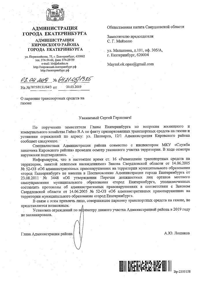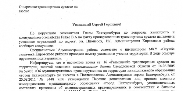 Номер жалобы:52126 Тип жалобы:Прочее Название объекта:Мэрия Регион:Свердловская область Город:Екатеринбург Адрес:улица Пионеров, 12к1 Описание жалобы:Необходима установка ограждений, препятствующих заезду автомобилей на газон с тротуара вдоль улицы и проезда вдоль дома. Статус:
