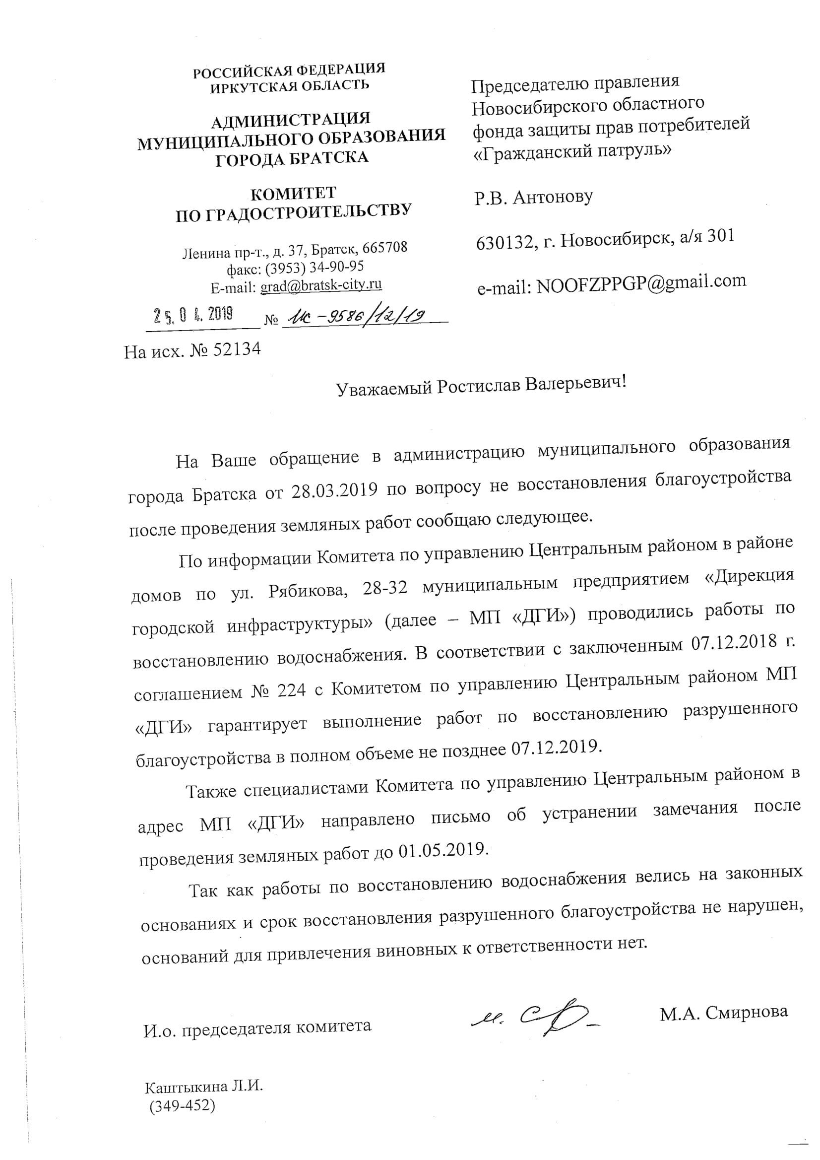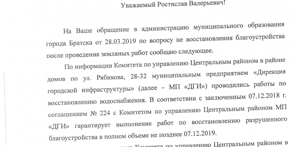 Номер жалобы:52134 Тип жалобы:Прочее Название объекта: Регион:Иркутская область Город:Братск Адрес:улица Рябикова, 32 Описание жалобы:Разрушено и не восстановлено благоустройство Статус: