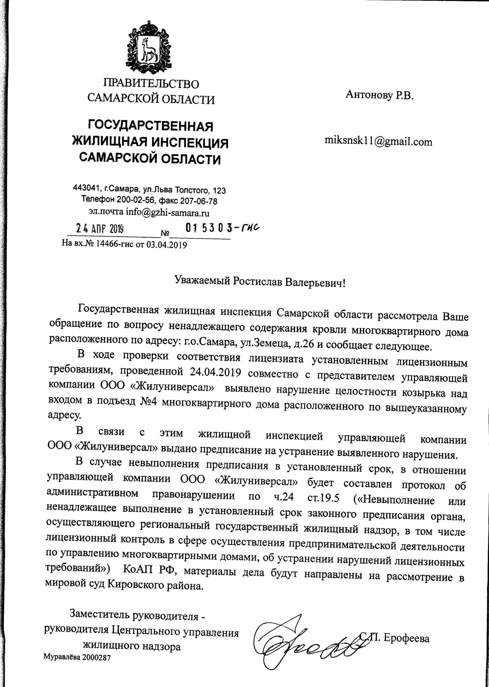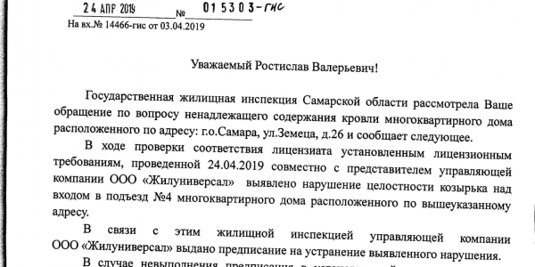 Номер жалобы:52140 Тип жалобы:Прочее Название объекта: Регион:Самарская область Город:Самара Адрес:улица Земеца, 26 Описание жалобы:После чистки крыши сломали козырёк .Почистили снег с крыши. И не убрали. Льдины так и лежат во дворе уже неделю Статус: