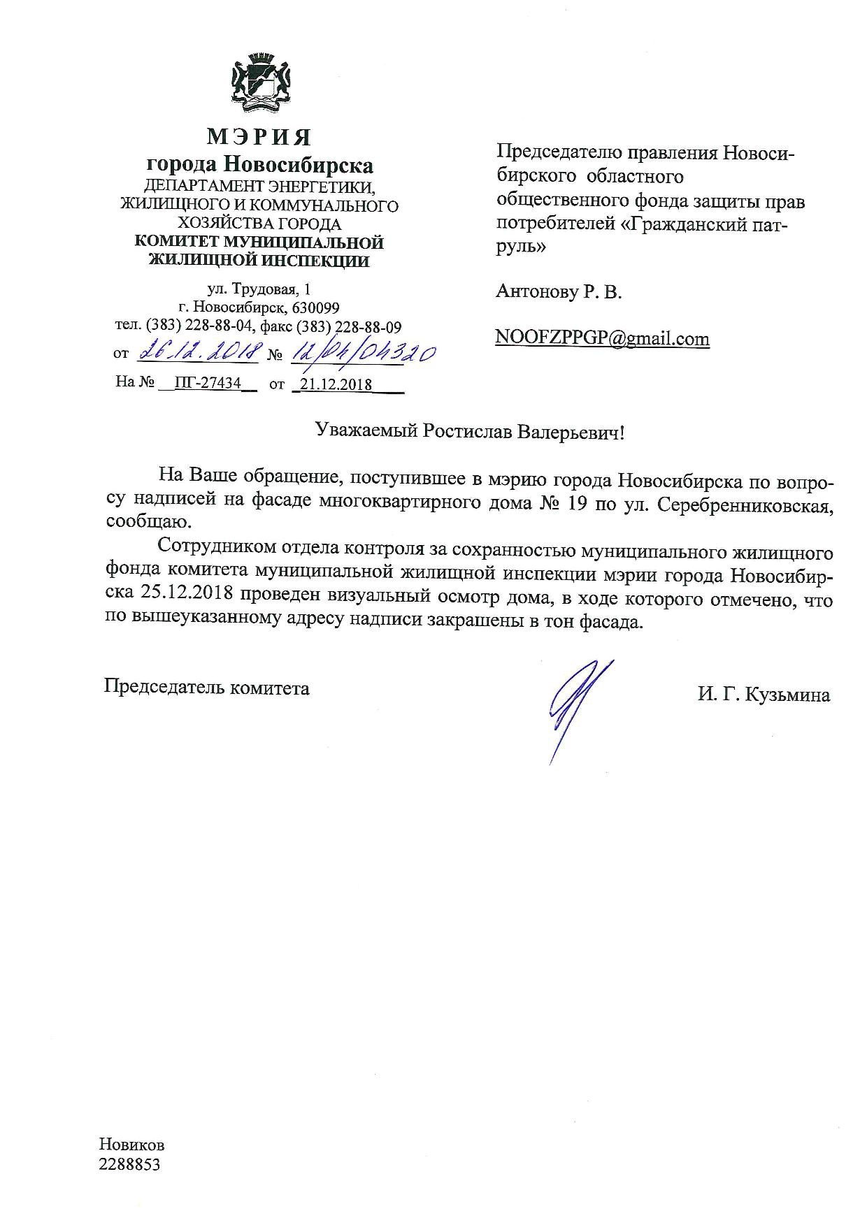 Номер жалобы:47266 Тип жалобы:Иные проблемы ЖКХ Название объекта: Регион:Новосибирская область Город:Новосибирск Адрес:Новосибирск, Красный проспект, 10 Описание жалобы:Надписи на фасаде дома Статус: