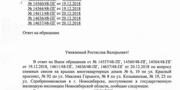 Номер жалобы:47251 Тип жалобы:Иные проблемы ЖКХ Название объекта: Регион:Новосибирская область Город:Новосибирск Адрес:ул Серебренниковская, 23 Описание жалобы:Снег на крыше дома Статус: