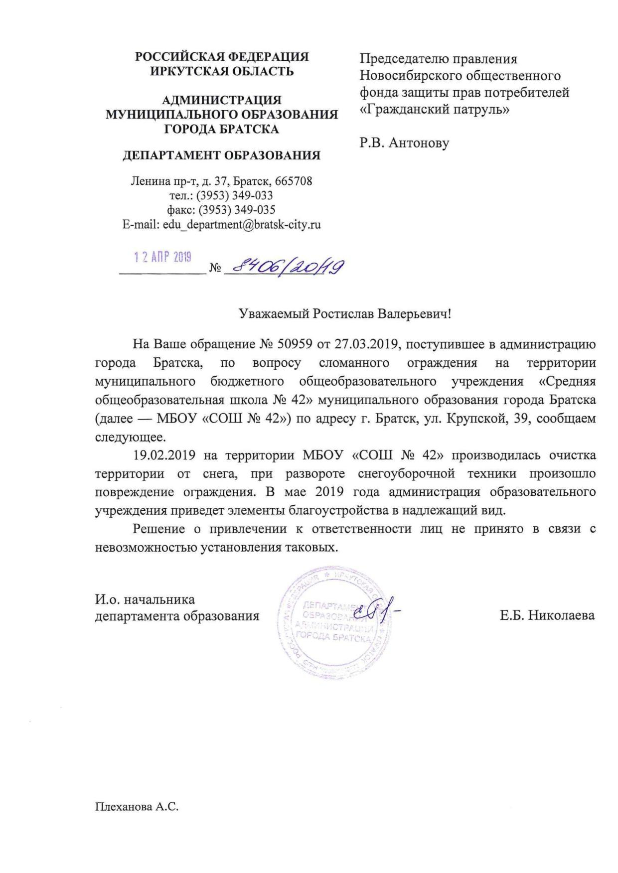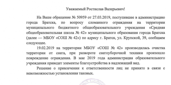 Номер жалобы:50959 Тип жалобы:Прочее Название объекта: Регион:Иркутская область Город:Братск Адрес:улица Крупской, 39 Описание жалобы:По адресу: Иркутская область, г Братск, ул. Крупской, 39 на территории МБОУ "Средняя общеобразовательная школа 42" ограждение учебного учреждения потеряло свою целостность. Прошу принять необходимые меры. Статус: