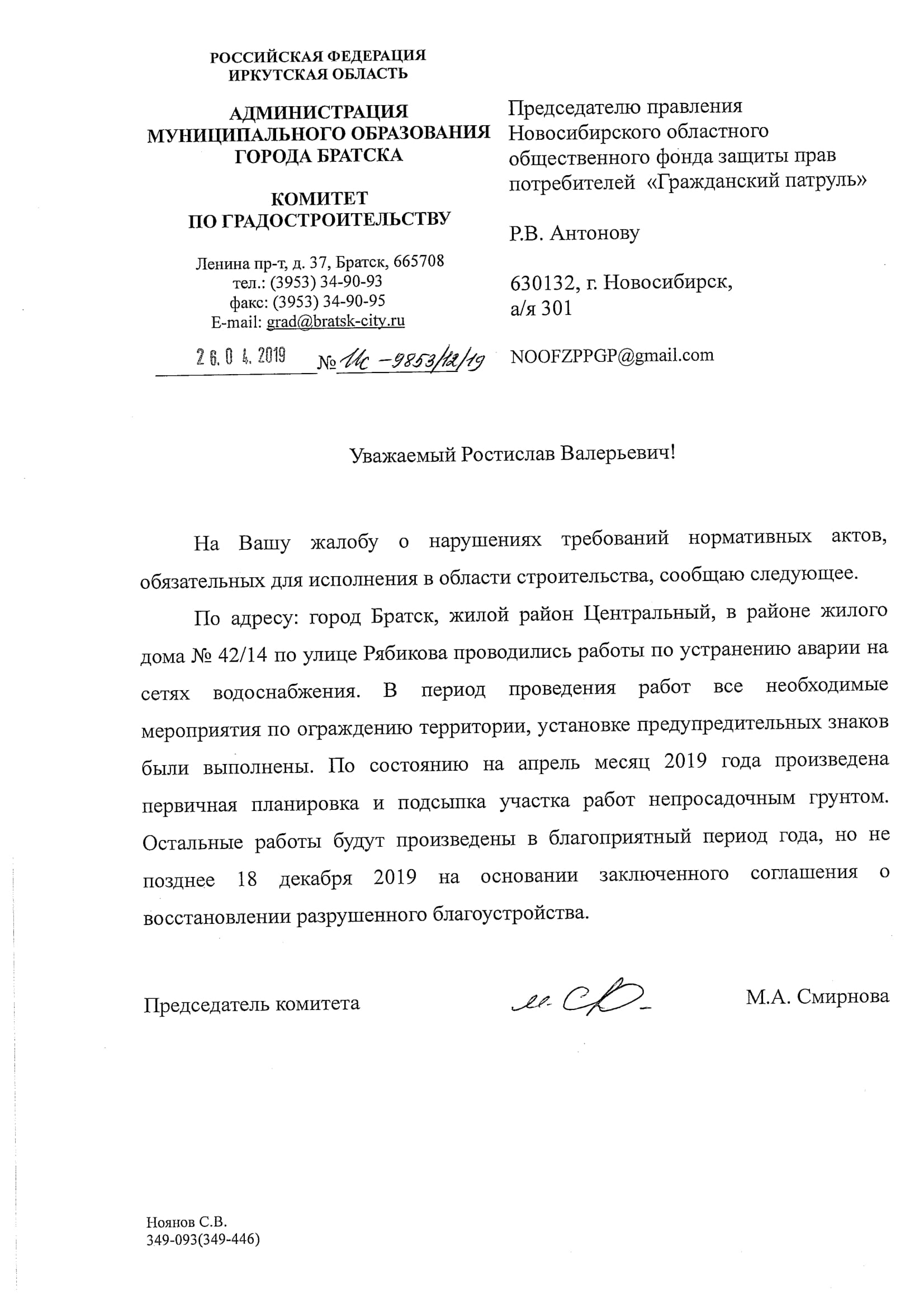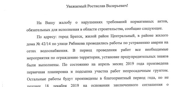 Номер жалобы:51070 Тип жалобы:Прочее Название объекта: Регион:Иркутская область Город:Братск Адрес:улица Рябикова, 42/14 Описание жалобы:При ведении земляных работ яма на огорожена, не выставлены знаки опасности на тротуаре и дороге. Адрес Рябикова 42 или Муханова 14(угловой дом). Ранее об этом сообщалось в жалобе 48261, но администрацией города не было принято достаточных мер к поиску опасного места, хотя адрес был очевиден. Прошу направить в прокуратуру. Повод: нарушение прав граждан на безопасность среды обитания, неполное исполнение администрацией мер для безопасности граждан или как-то так. Статус: