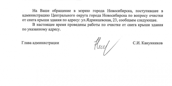 Номер жалобы:47005 Тип жалобы:Иные проблемы ЖКХ Название объекта: Регион:Новосибирская область Город:Новосибирск Адрес:Новосибирск, Ядринцевская улица, 23 Описание жалобы:Снег на крыше дома Статус: