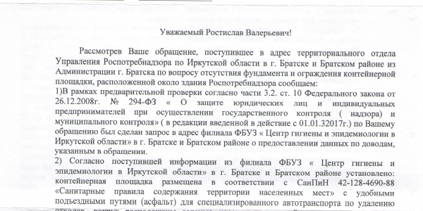 Номер жалобы:46969 Тип жалобы:Иные проблемы ЖКХ Название объекта: Регион:Иркутская область Город:Братск Адрес:улица Муханова, 20 Описание жалобы:Контейнер мусорный без ограждения и фундамента у здания роспотребнадзора Статус:
