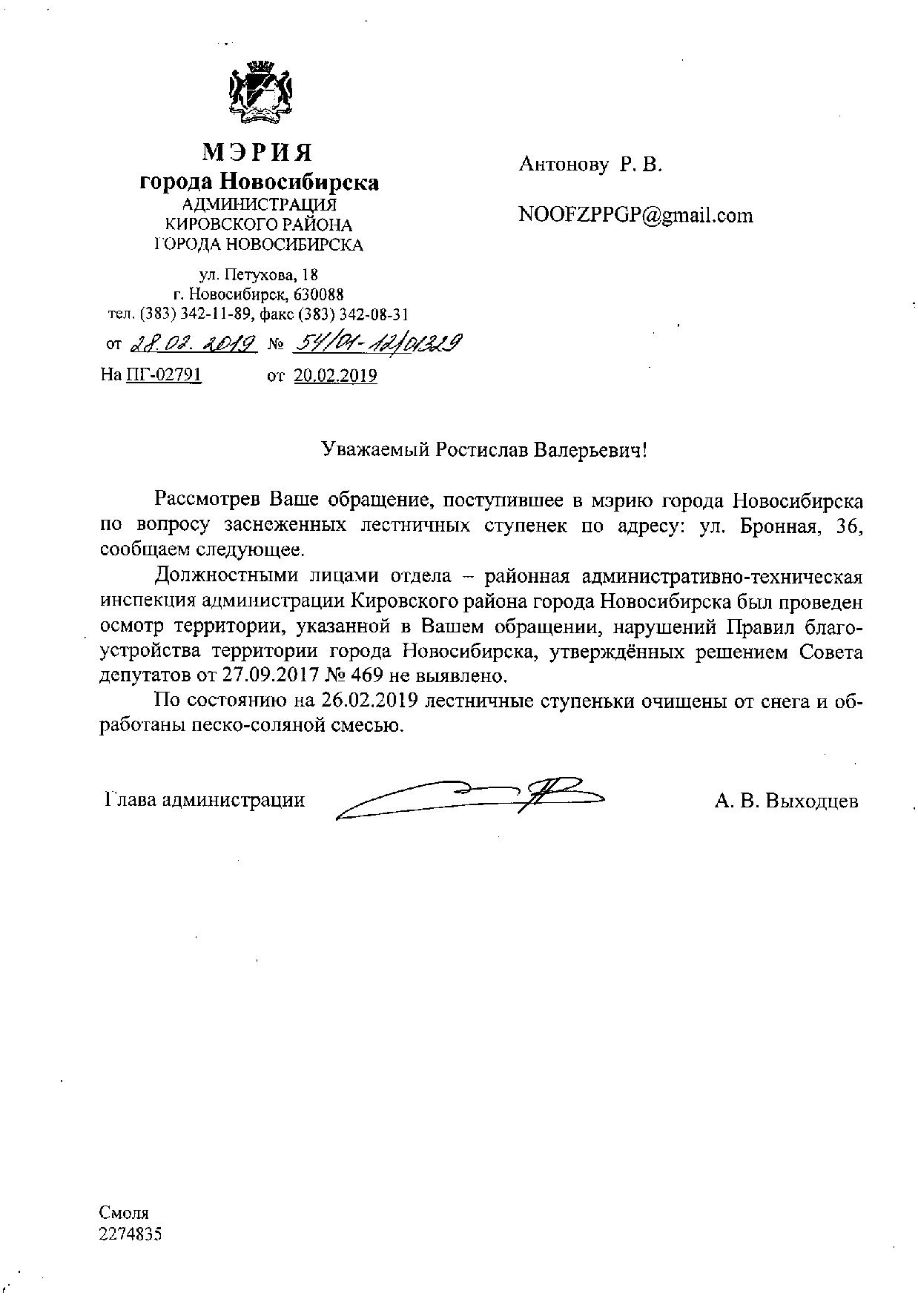 Номер жалобы:50170 Тип жалобы:Прочее Название объекта: Регион:Новосибирская область Город:Новосибирск Адрес:Бронная улица, 36 Описание жалобы:Не расчищены ступеньки Статус: