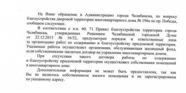 Номер жалобы:46663 Тип жалобы:Иные проблемы ЖКХ Название объекта:Администрация Калининского Района Город:Челябинск Адрес:Челябинск, 196А проспект Победы Описание жалобы:из земли торчат металлические трубы, о которые люди спотыкаются. Прошу их полностью удалить Статус: