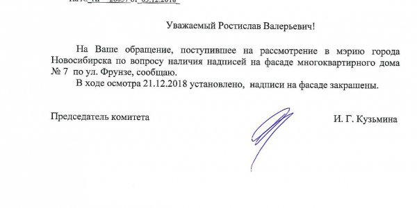 Номер жалобы:46562 Тип жалобы:Иные проблемы ЖКХ Название объекта: Регион:Новосибирская область Город:Новосибирск Адрес:Новосибирск, улица Фрунзе, 7 Описание жалобы:Надписи на фасаде дома Статус: